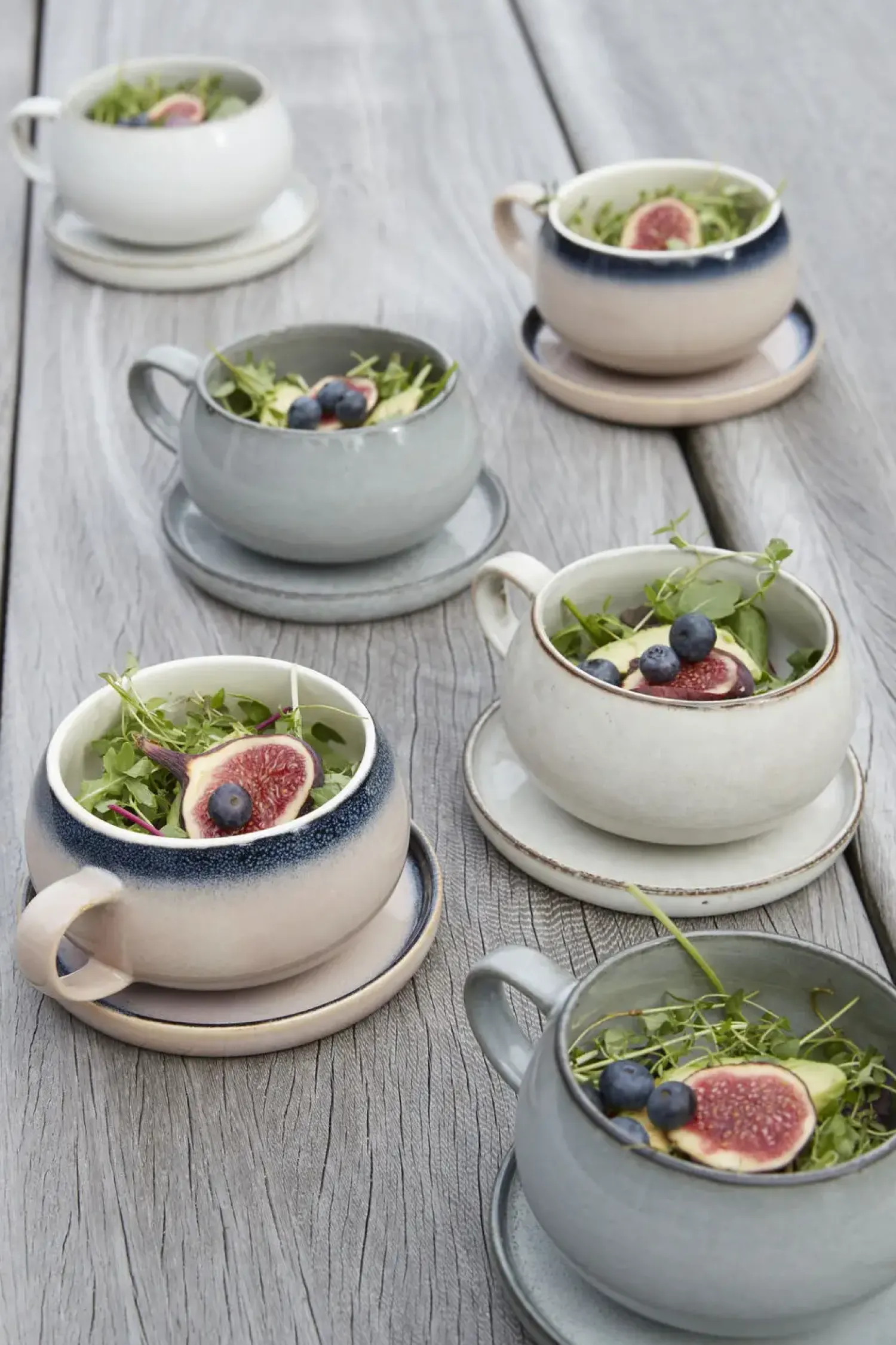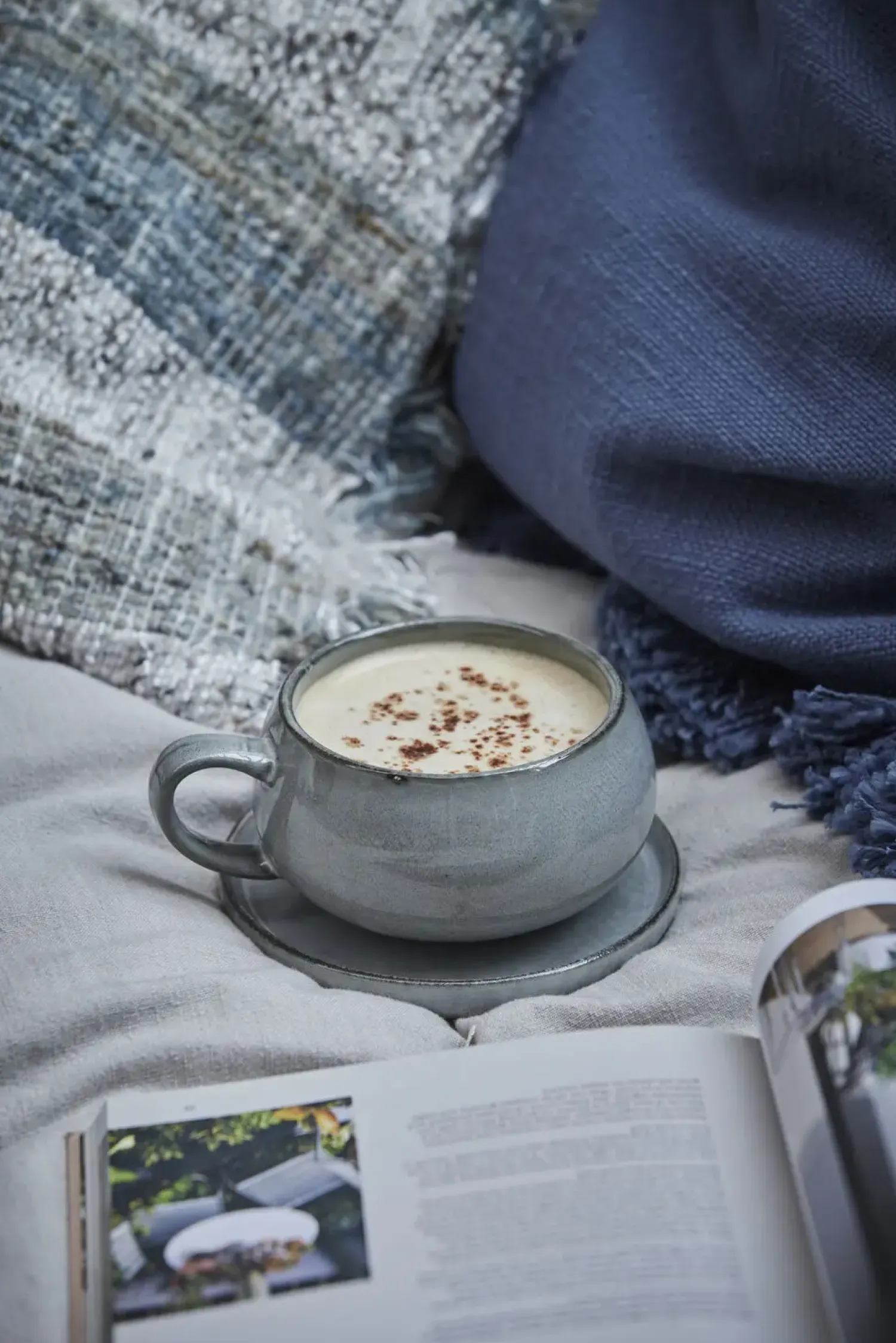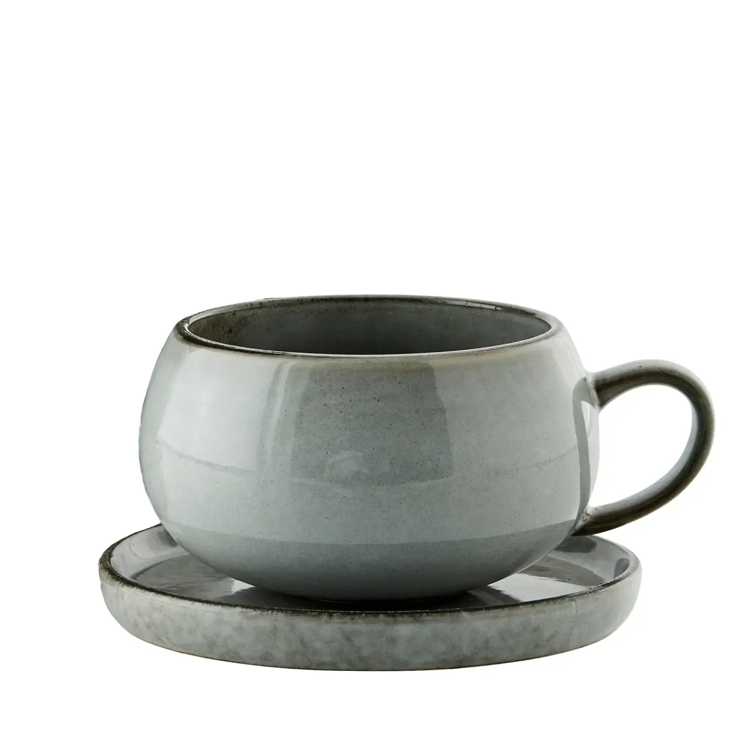 Smuk grå stentøj kop/underkop fra LENE BJERRE. Tilføj et islæt af glæde og skævhed med denne Amera kop/underkop, som måler H7,5xØ14 cm. og kan indeholde 40 cl. Med sine rolige farver og bløde organiske former, vil koppen med garanti skabe en hyggelig stemning ved dit bord. Denne kop/underkop er en del af Amera serien. Charmen og kendetegnet for produkterne i Amera serien er, at produkterne er belagt med dobbelt reaktiv glasur. Dette betyder af der kan forekomme variationer i farve og udseende fra produkt til produkt.