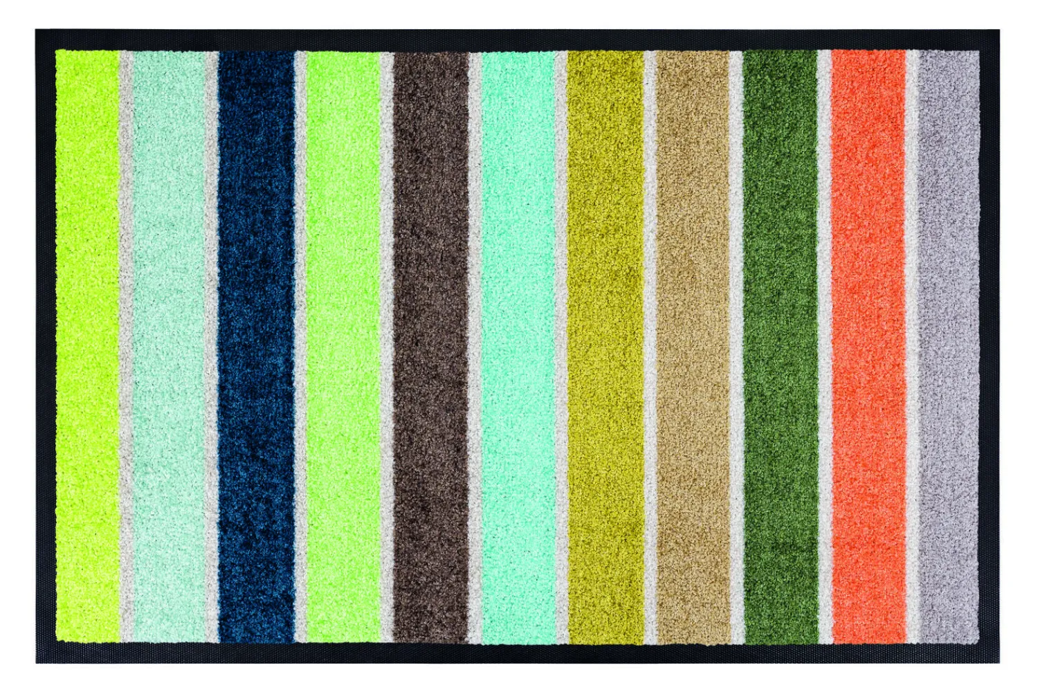 Denne dørmåtte byder gæster velkommen med et farverigt udtryk. Den har vertikale striber i en række farver, herunder blå, grøn, gul, brun, orange og grå, hvilket giver den et distinkt udseende. Måtten er designet til at passe ind i forskellige indretningsstile og kan bruges både i moderne og klassiske hjem.