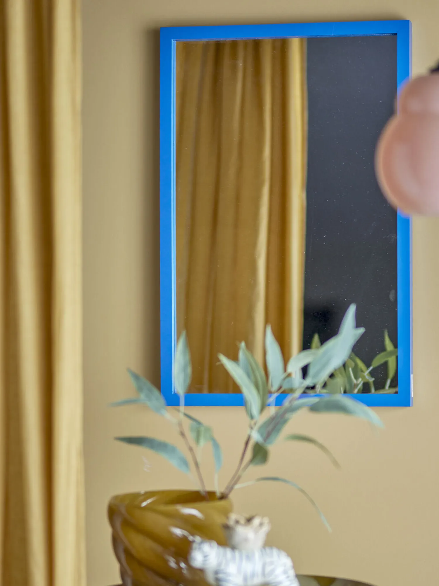 Den blå ramme fungerer som et dekorativt element, der kan blive et naturligt samlingspunkt i rummet. Med en dybde på kun 3,5 cm sidder spejlet tæt på væggen og skaber en harmonisk integration i din indretning.