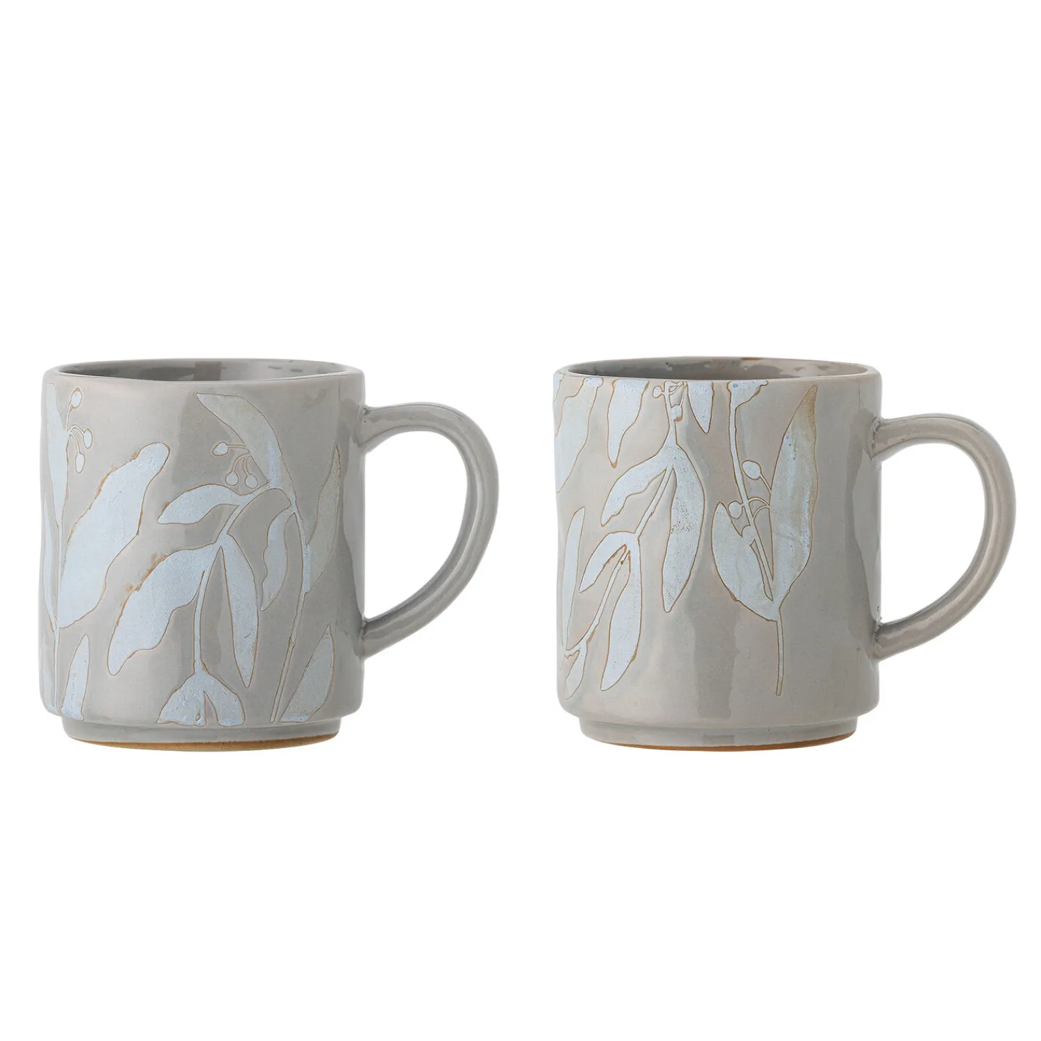 Dette sæt giver dig to robuste stentøjskrus i grå nuancer med et dekorativt bladmotiv. Den reaktive glasur skaber et unikt udtryk, mens den ubehandlede bund tilføjer en håndværksmæssig detalje til dit køkken.