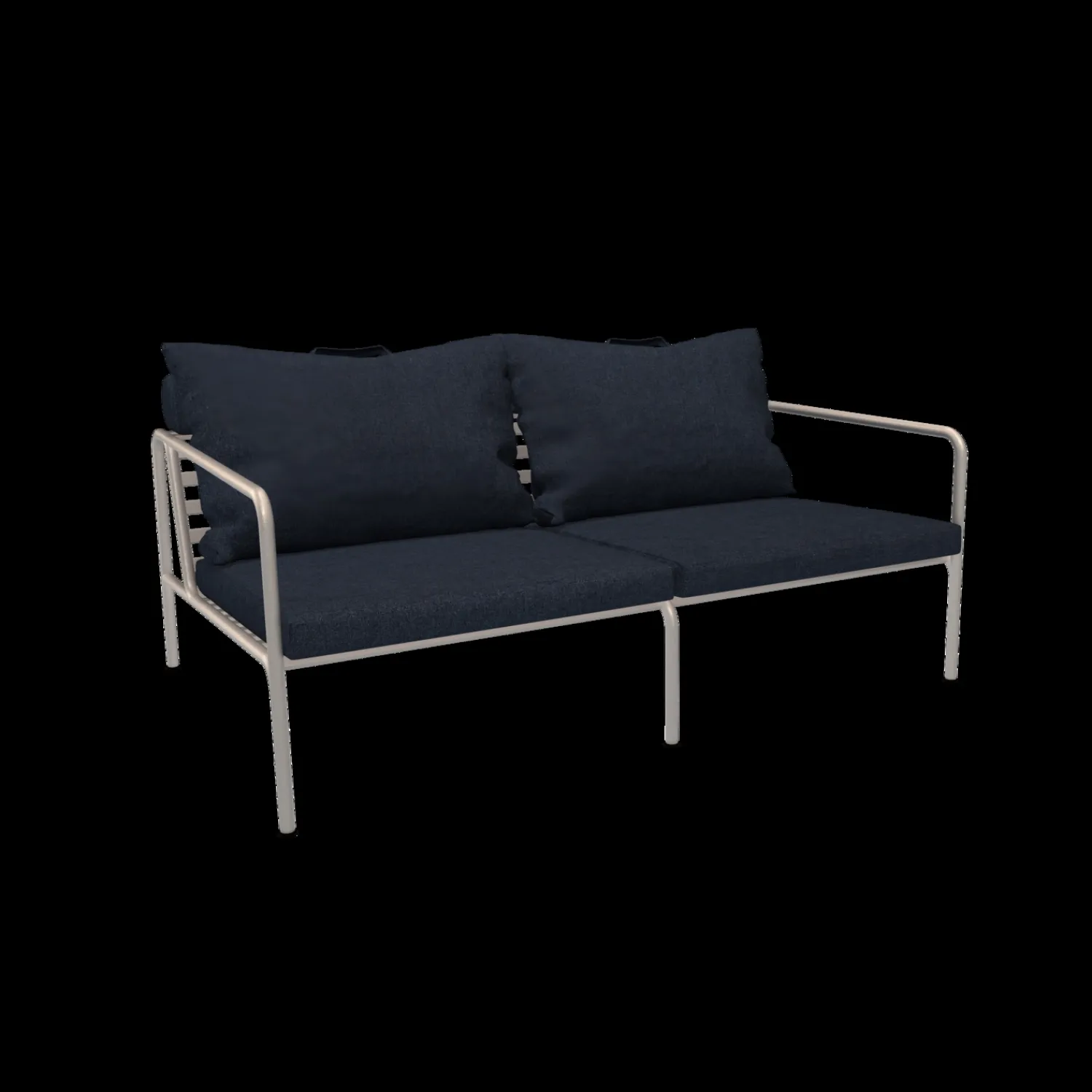 2-personers havemøbel med vandafvisende Sunbrella Heritage-puder i Sky og stel i Muted Hvid. Stoffet indeholder 50 % genanvendt akryl for holdbarhed i dansk vejr.