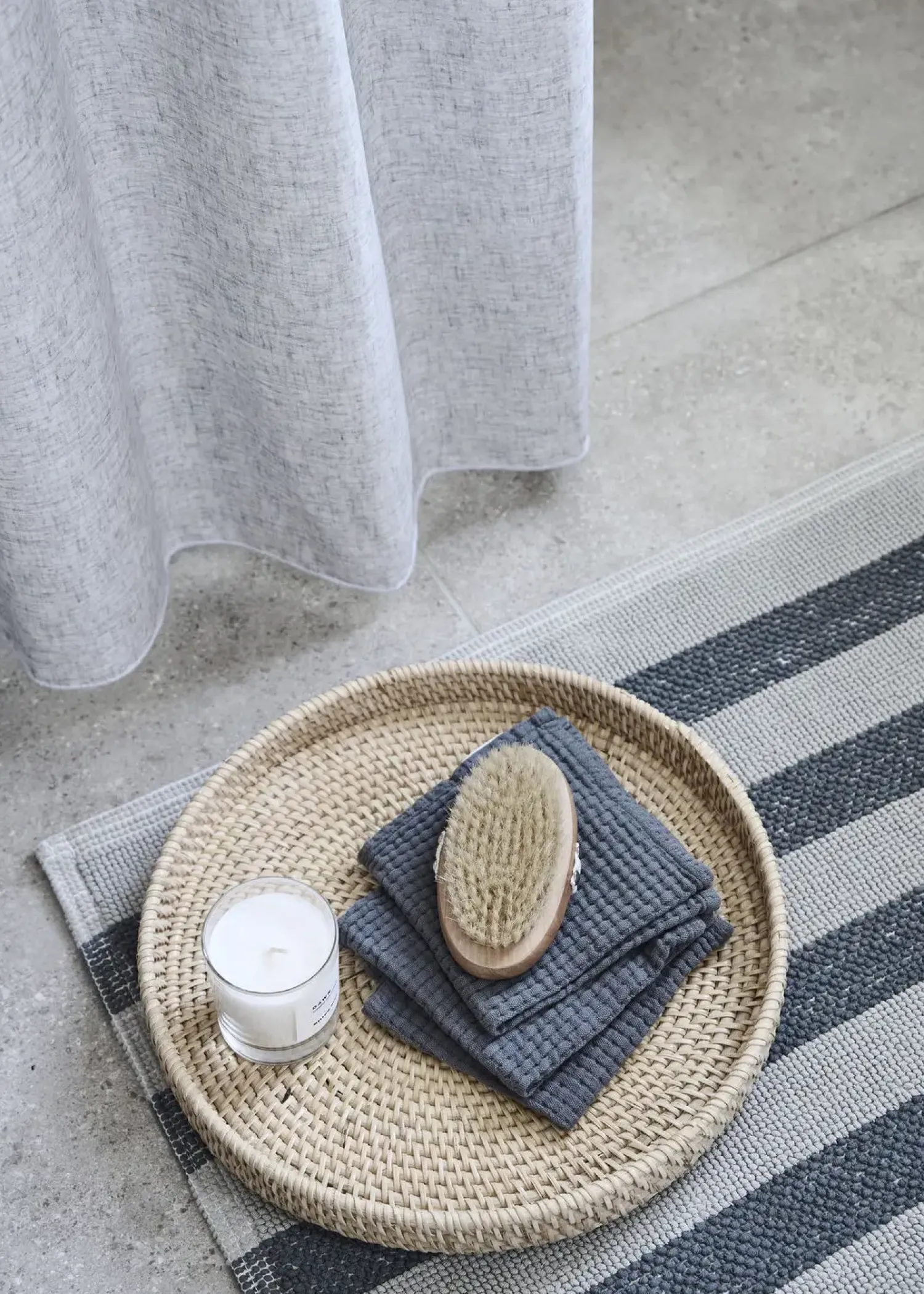 Det grå hør-look skaber en rolig og tidssvarende stemning i badeværelset. Rynkebåndet sikrer et jævnt fald, der både ser godt ud og fungerer effektivt. Målene på 140 x 200 cm passer til de fleste standardbadeværelser.