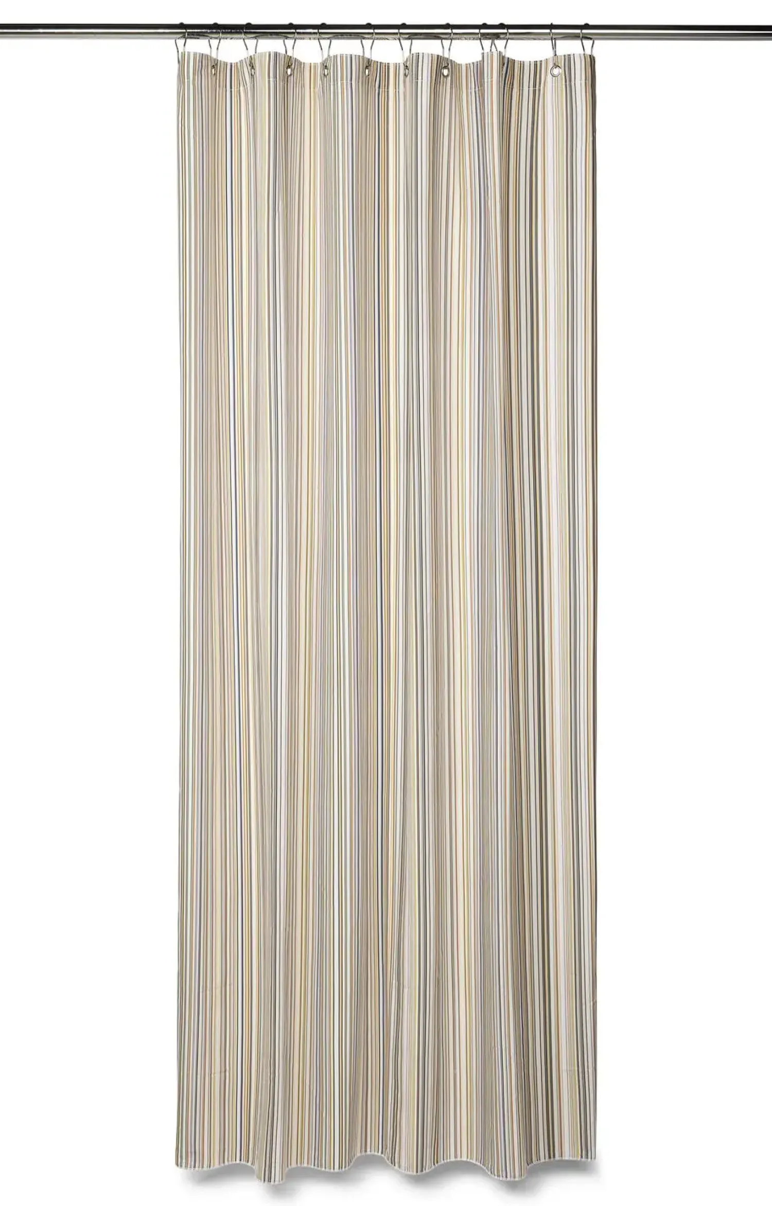 De 12 indbyggede metaløjer sikrer, at badeforhænget hænger jævnt og er nemt at trække frem og tilbage. Det stribede design tilfører et moderne præg, mens de præcise mål passer til standardbadeværelser.