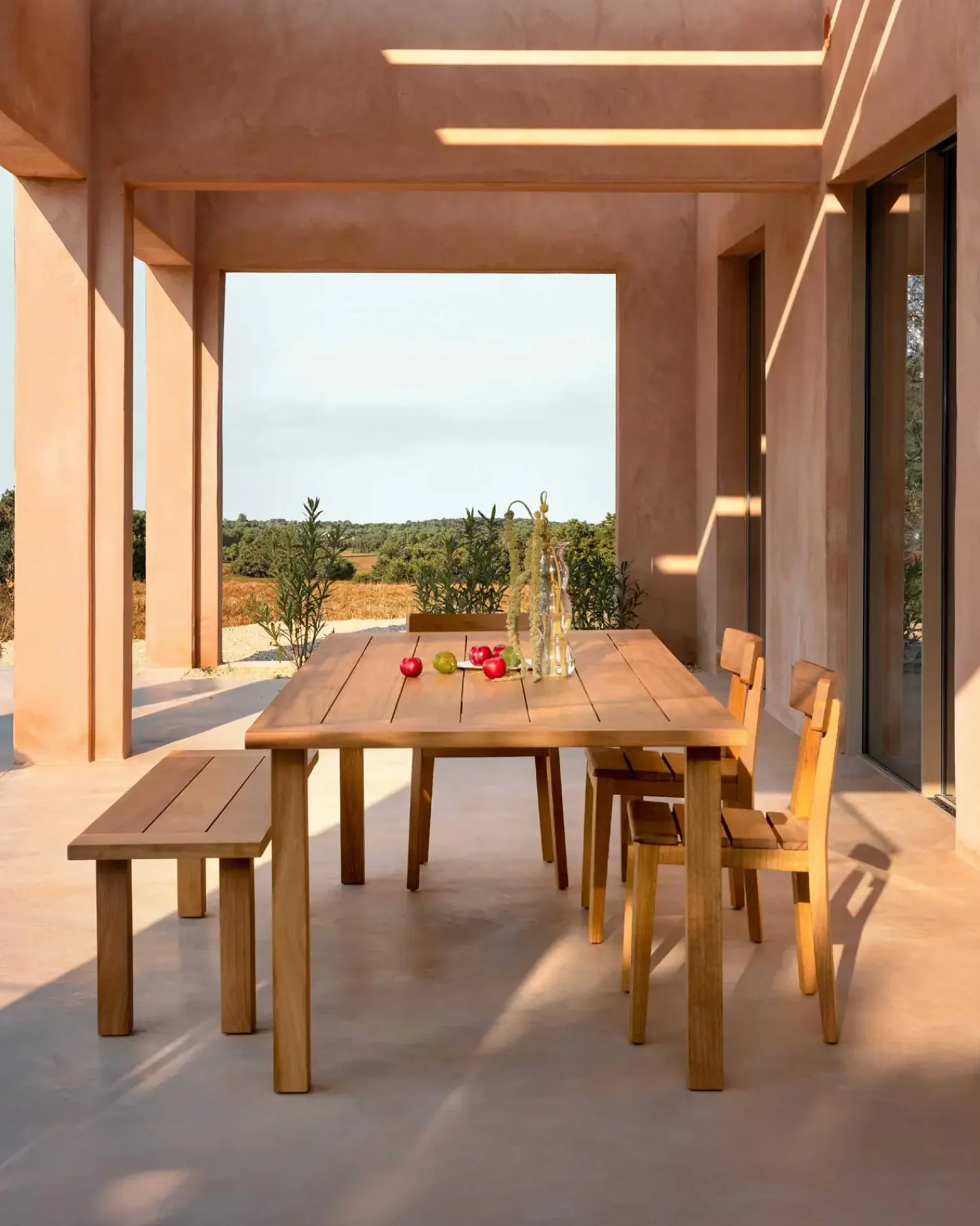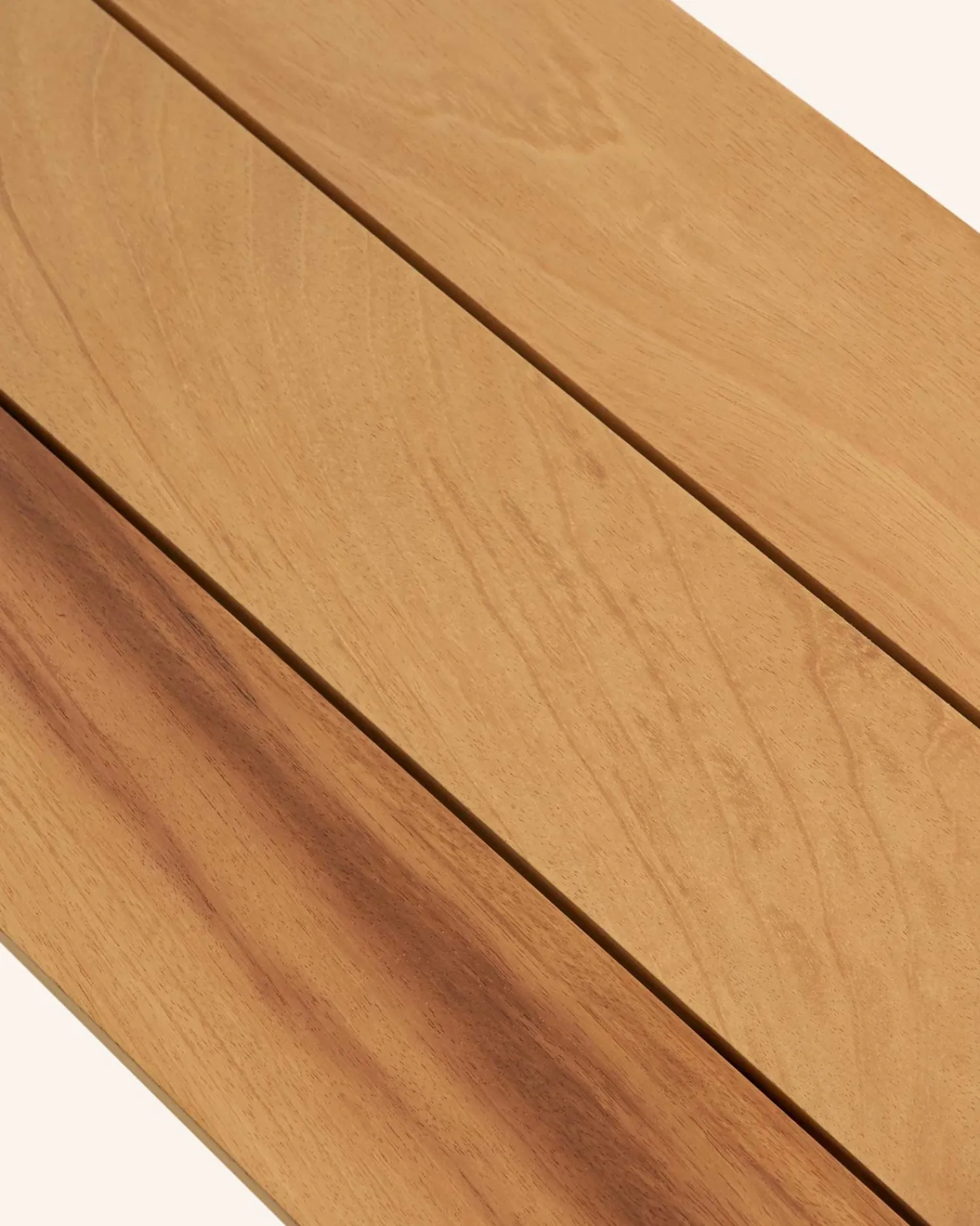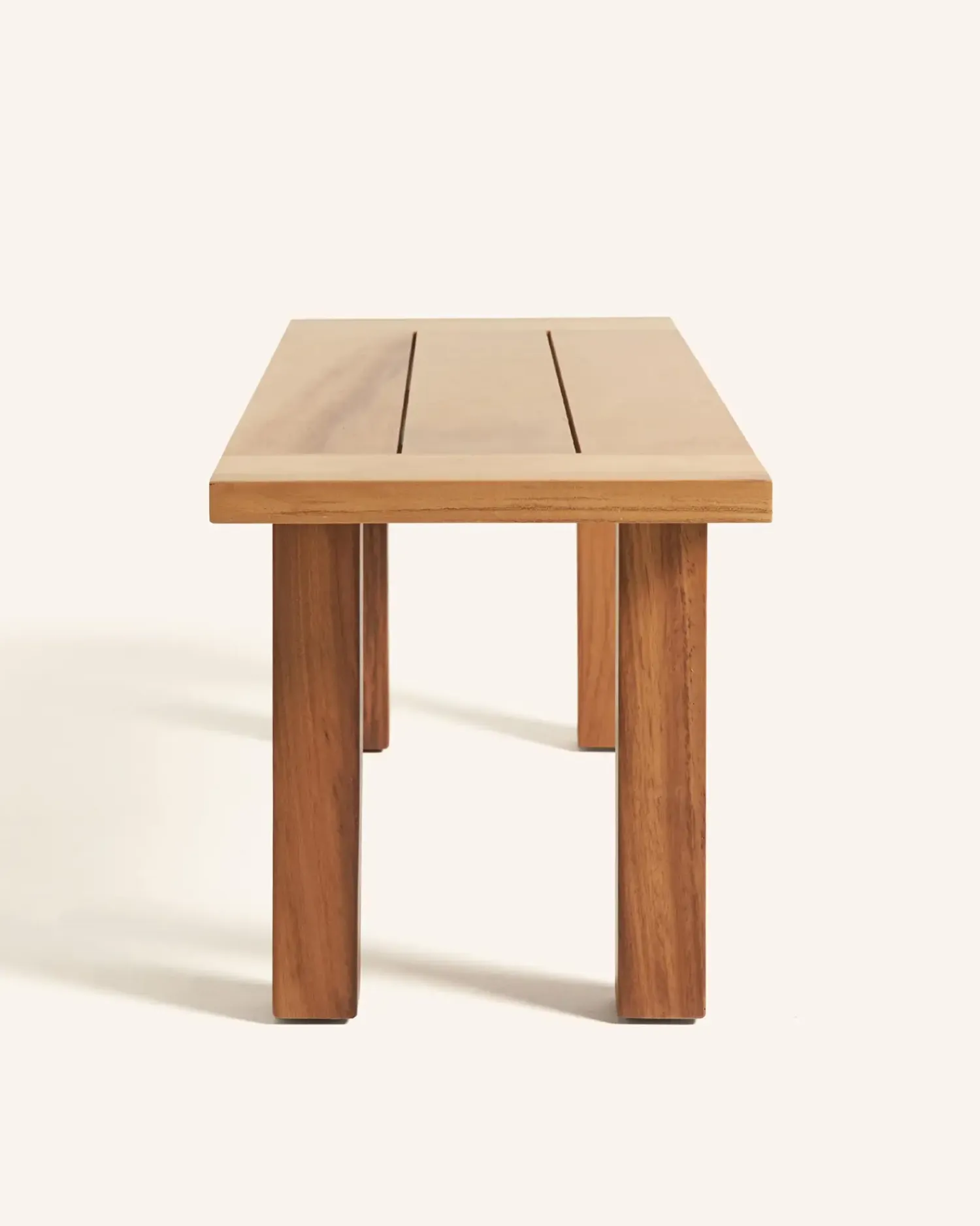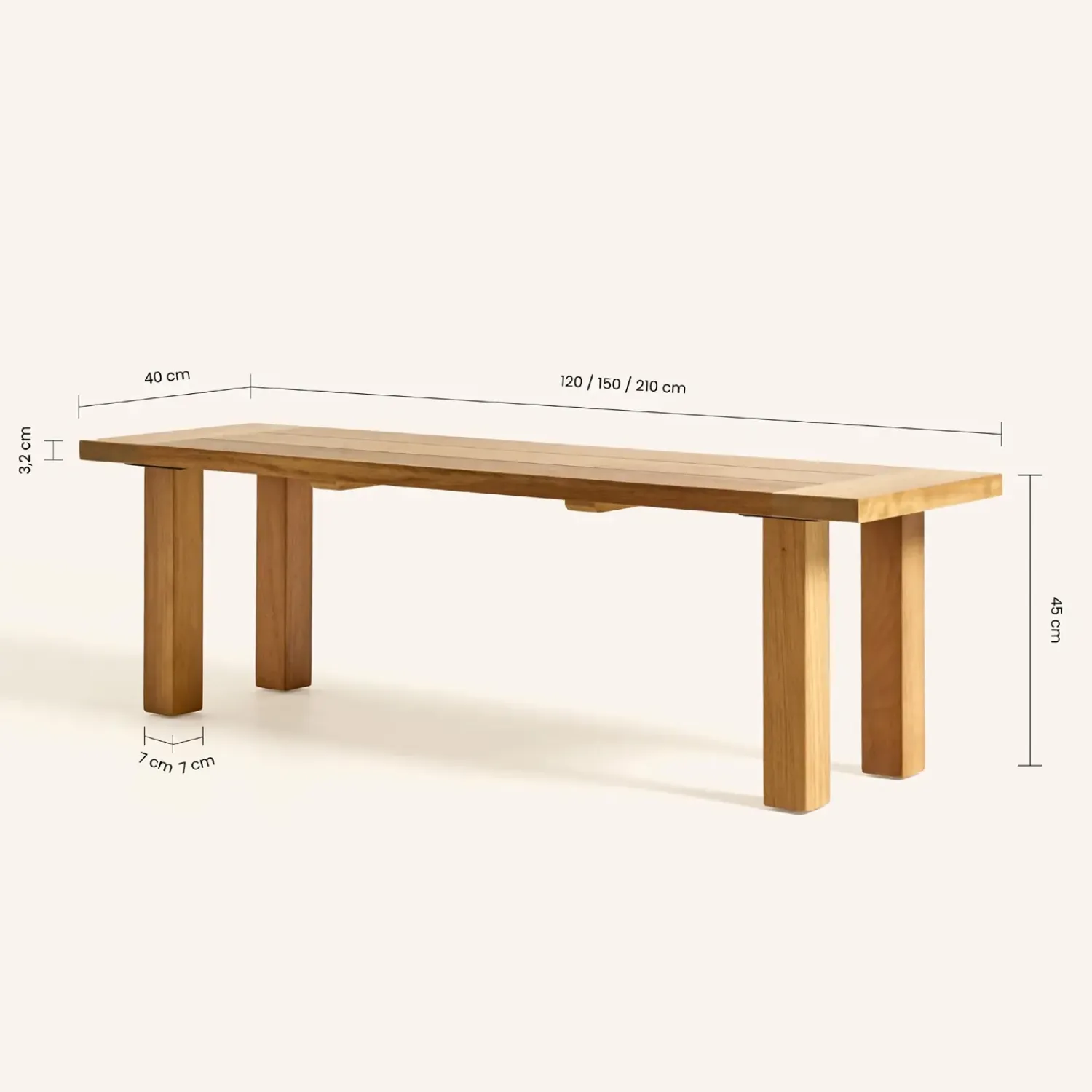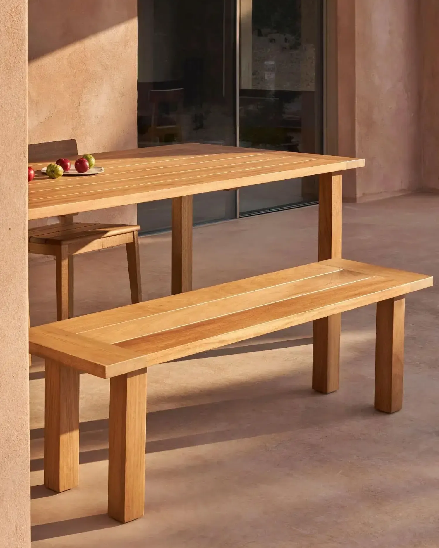 Bænken er fremstillet i Valencia af massivt Iroko-træ, hvilket sikrer både holdbarhed og modstandsdygtighed. Derudover vil træets karakteristiske naturlige farvespil og åretegninger skabe en visuelt attraktiv kontrast til omgivelserne.