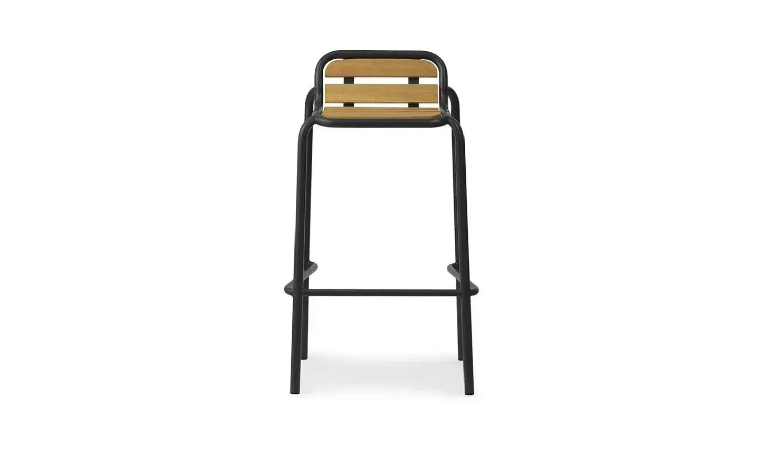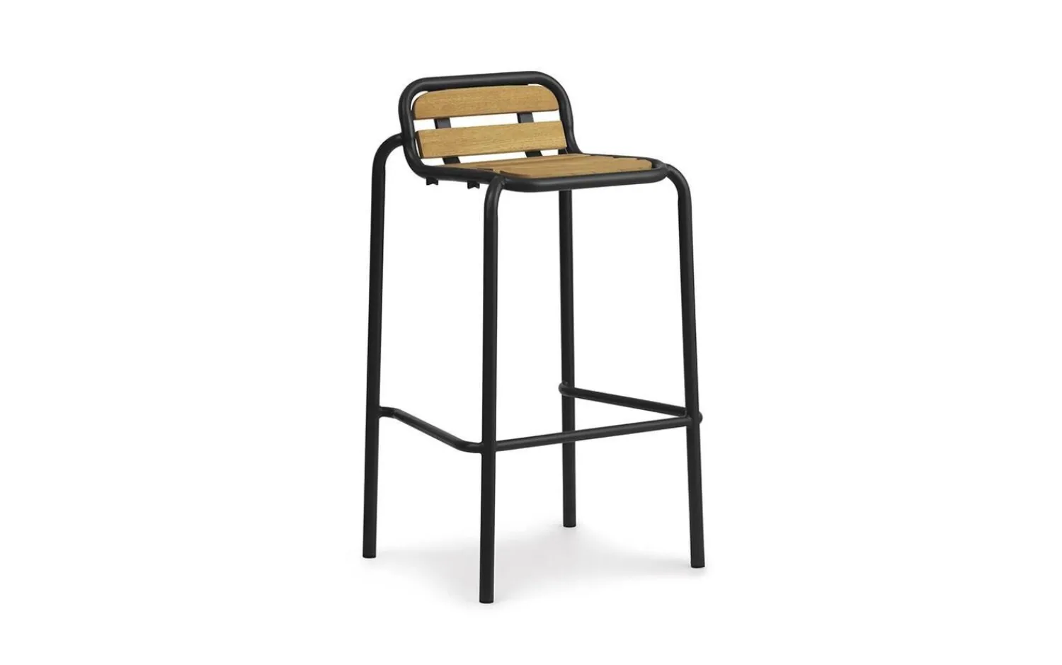 Du får en barstol, der er skabt til udendørs brug. Det sorte stel med enkle linjer og de horisontale trælameller i ryglænet giver dig en stol, der passer ind i enhver haveoase. Den er særligt velegnet til din udendørs bar eller højbord.