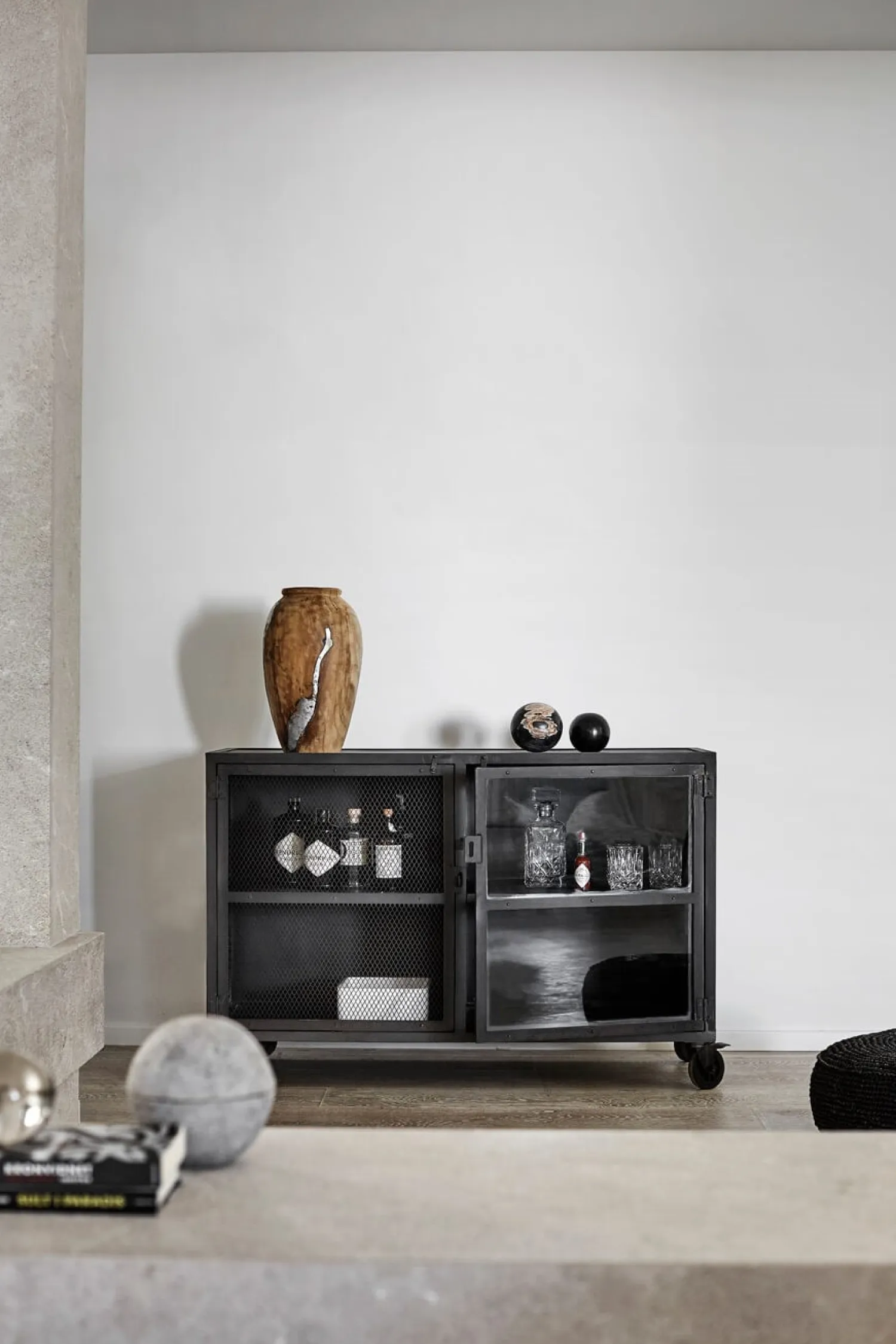 Barskab 21 er designet med fokus på praktisk anvendelse. De fire hjul gør det nemt at flytte skabet, så du kan placere det efter behov, hvad enten det er i stuen, køkkenet eller hjemmekontoret. Jernkonstruktionen giver skabet holdbarhed og en distinkt visuel profil, der kan passe ind i forskellige indretningsstile.