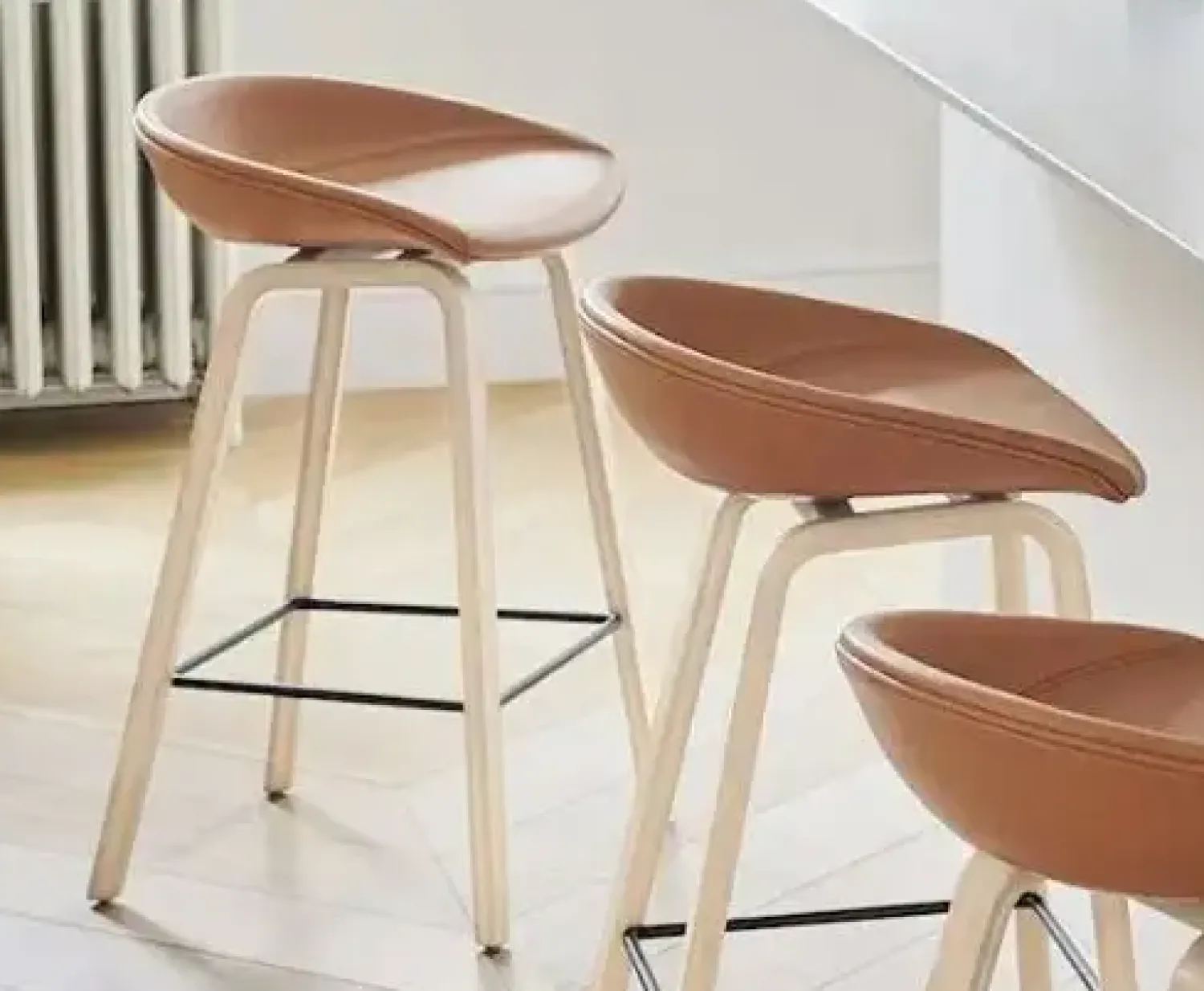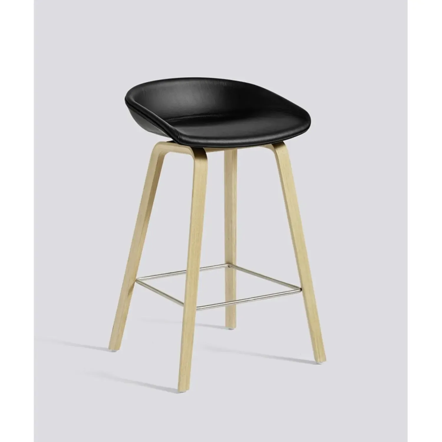 Denne barstol fra HAY har ben i egetræ, sort Sierra-læder og fodstøtte. Med en højde på 76 cm og en sædehøjde på 64 cm passer den til køkkenøer og barborde, hvilket giver fleksibilitet i indretningen.