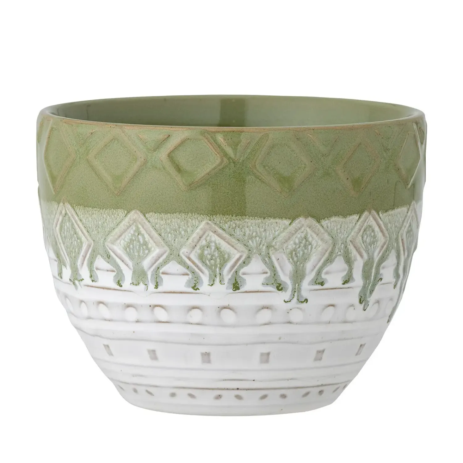 Basel urtepotteskjuleren udmærker sig ved sit særprægede udseende. Den grønfarvede løbende glasur giver hvert eksemplar et individuelt udtryk, mens de geometriske og teksturerede mønstre langs siderne tilfører dybde og karakter. Den blanke finish fuldender det sofistikerede look, og farvevariationer kan forekomme på grund af glasurens natur, hvilket bidrager til produktets unikke karakter. Det tofarvede design med en grøn øverste sektion og en hvid nederste sektion skaber en visuel kontrast, der fanger øjet.