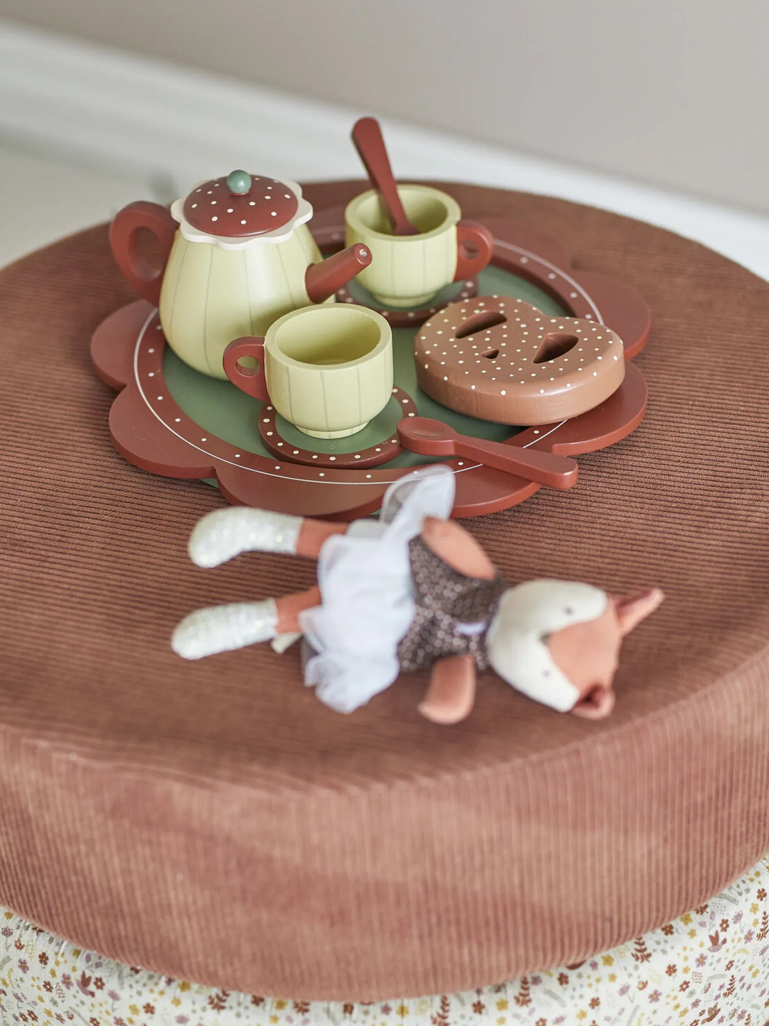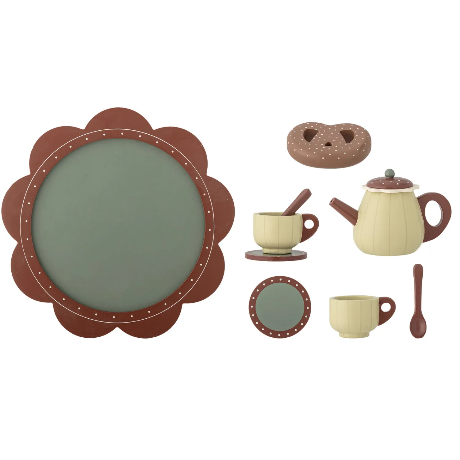 De brune nuancer giver sættet et naturligt og tidløst udtryk. Med tekande, kopper og andre køkkenredskaber kan dit barn lave teselskaber og lege restaurant. De afrundede former og robuste materialer sikrer lang holdbarhed.