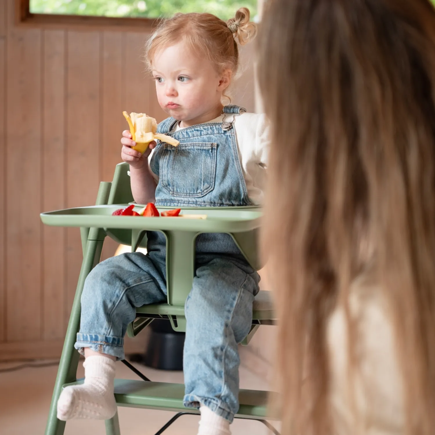 Med det intuitive kliksystem kan du hurtigt montere og afmontere både bøjlen og bakken på din KLAPP® højstol. Det gør det nemt at tilpasse stolen til forskellige situationer i løbet af dagen, hvad enten det er måltider eller leg.