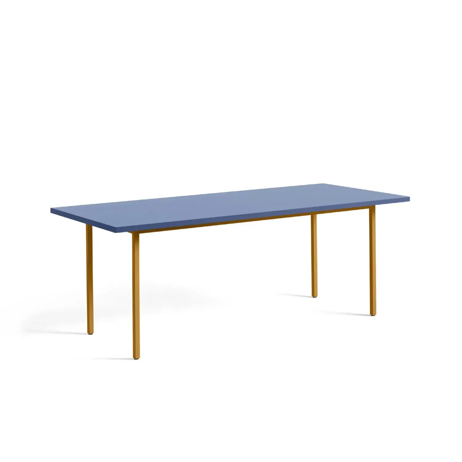 Dette spisebord fra Hay kombinerer en blå Valchromat-bordplade med okkergule ben i pulverlakeret stål. Materialevalget sikrer både holdbarhed i hverdagen og et markant udtryk i din spisestue.