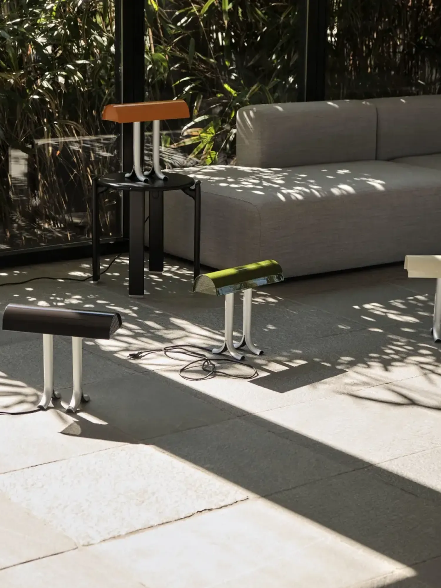 Anagram bordlampen fra HAY kombinerer vådsprøjtet stål med en karakteristisk halv-cirkulær skærm i grøn. Med to buede metalliske ben står lampen stabilt på dit skrivebord eller sidebord, mens den 200 cm lange sorte ledning giver dig frihed til placering.