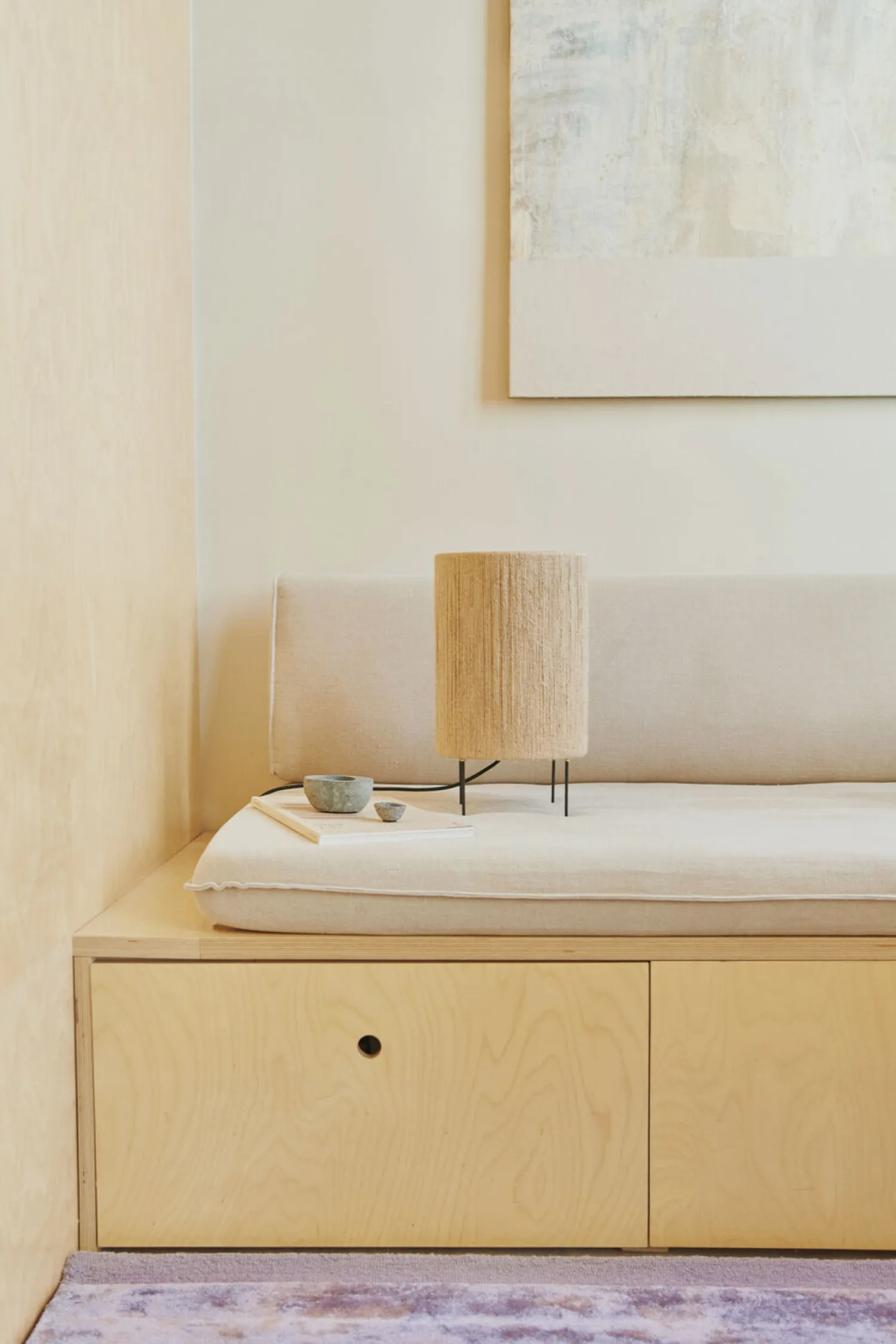 Denne bordlampe er håndlavet med fokus på funktionalitet og æstetik. Med en højde på 40 cm passer den både til skrivebordet og som belysning i stuen. Lampeskærmen er bundet med jutegarn omkring en base.