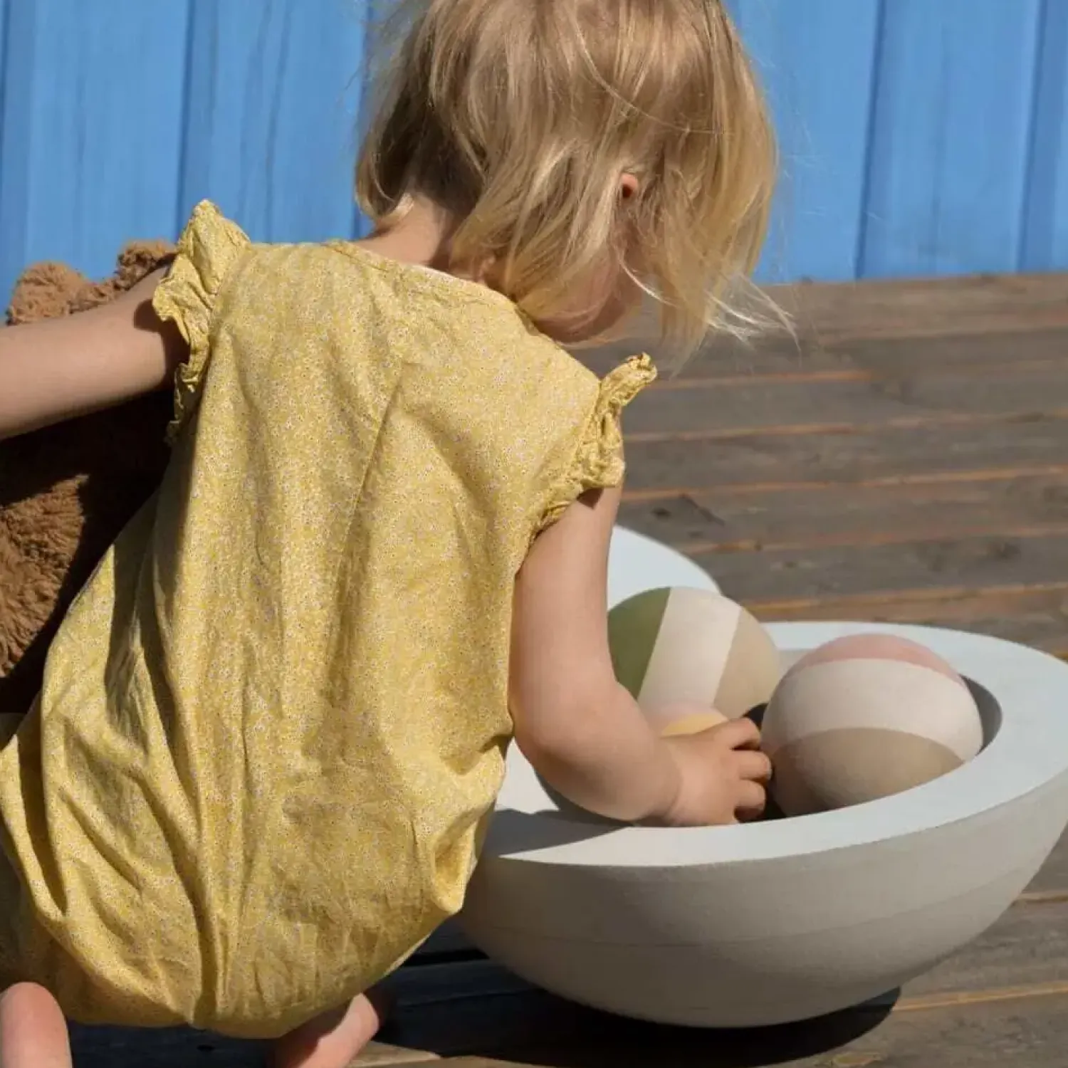Bowl kan vendes og bruges som skammel, når børn skal nå højere op eller have et ekstra siddested. Den fungerer også som opbevaring til legetøj som klodser og biler, hvilket holder legeområdet organiseret. Den alsidige funktion betyder, at produktet vokser med barnets behov gennem forskellige faser.