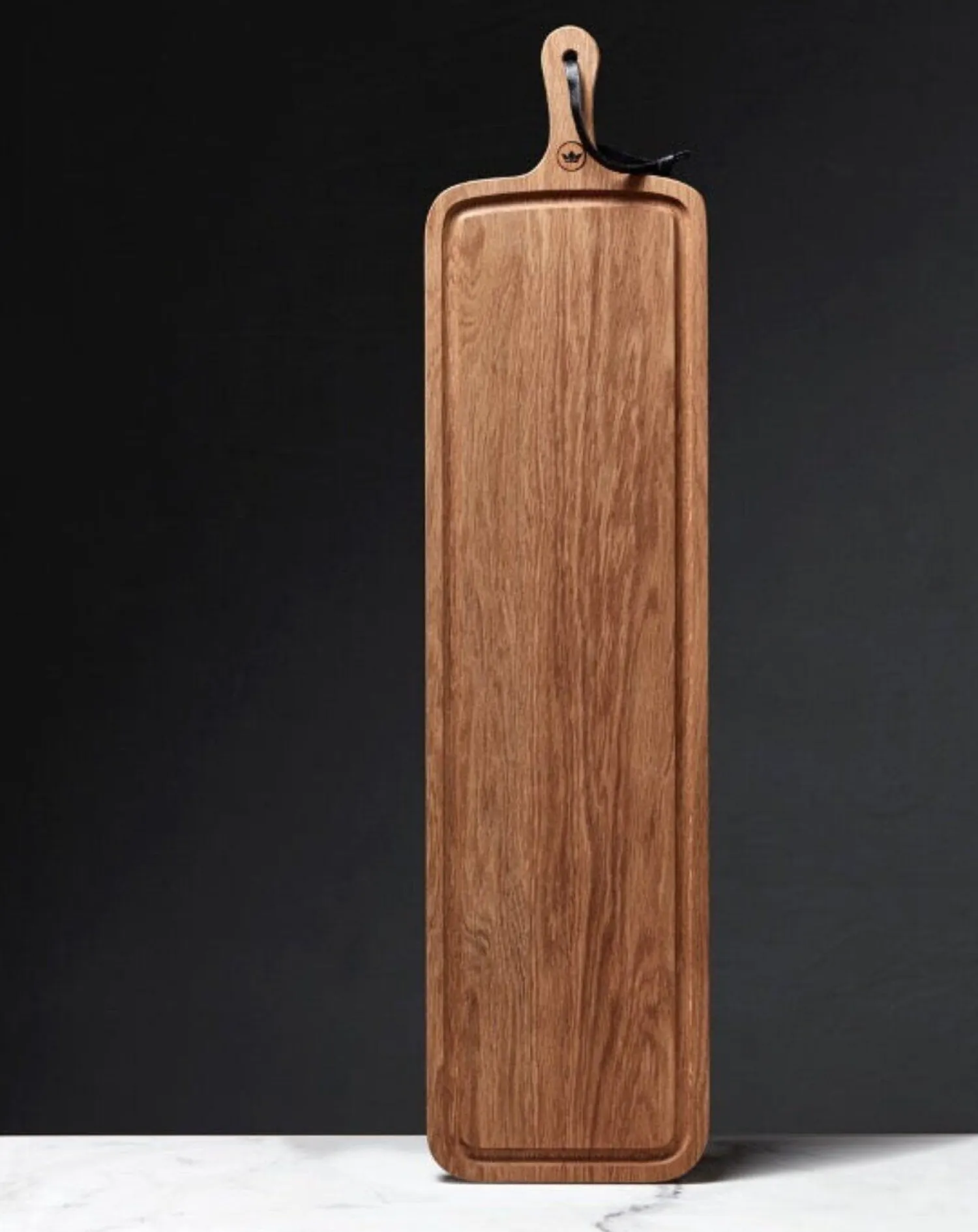 Et brødbræt med den perfekte størrelse til at dele et måltid med familie og venner. Præsenter din ret på dette bræt og imponer dine middagsmissioner. Eller brug den som skærebræt under forberedelserne. Selv at bære, som en serveringsbakke. Brug på 2 sider: den ene side til at skære, den anden side til en luksuriøs præsentation. Ikke til brug i mikrobølgeovn, ovn eller opvaskemaskine. 100% massiv valnød. Størrelse: 19×70 cm