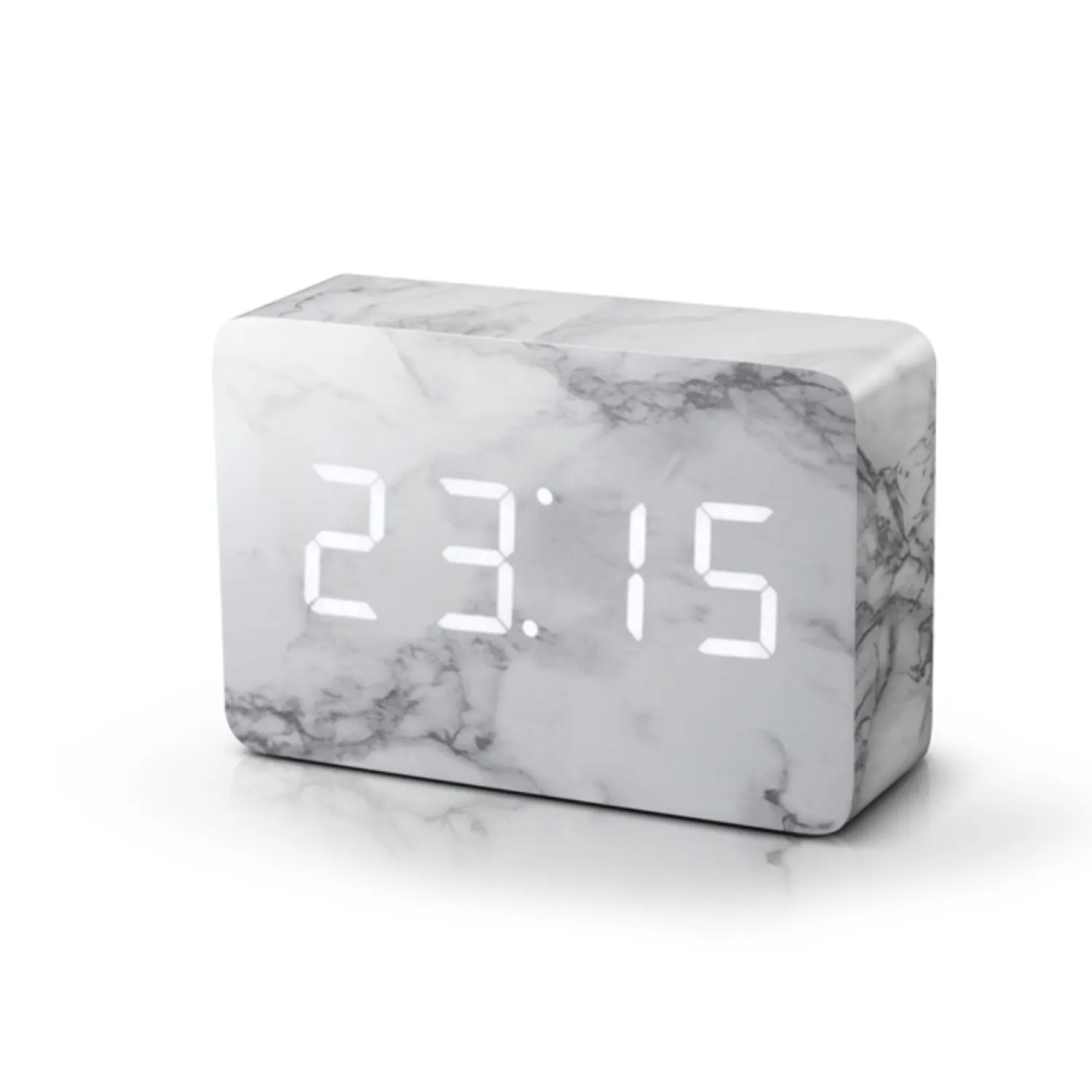 Dette vækkeur kombinerer funktionalitet med et marmorlook, hvor hvide LED-tal svæver på overfladen. Uret viser klokkeslæt, dato og temperatur samlet på ét display, så du får flere oplysninger med et enkelt blik. LED-displayet aktiveres ved berøring eller lyd og slukker automatisk i stille omgivelser for at spare energi.