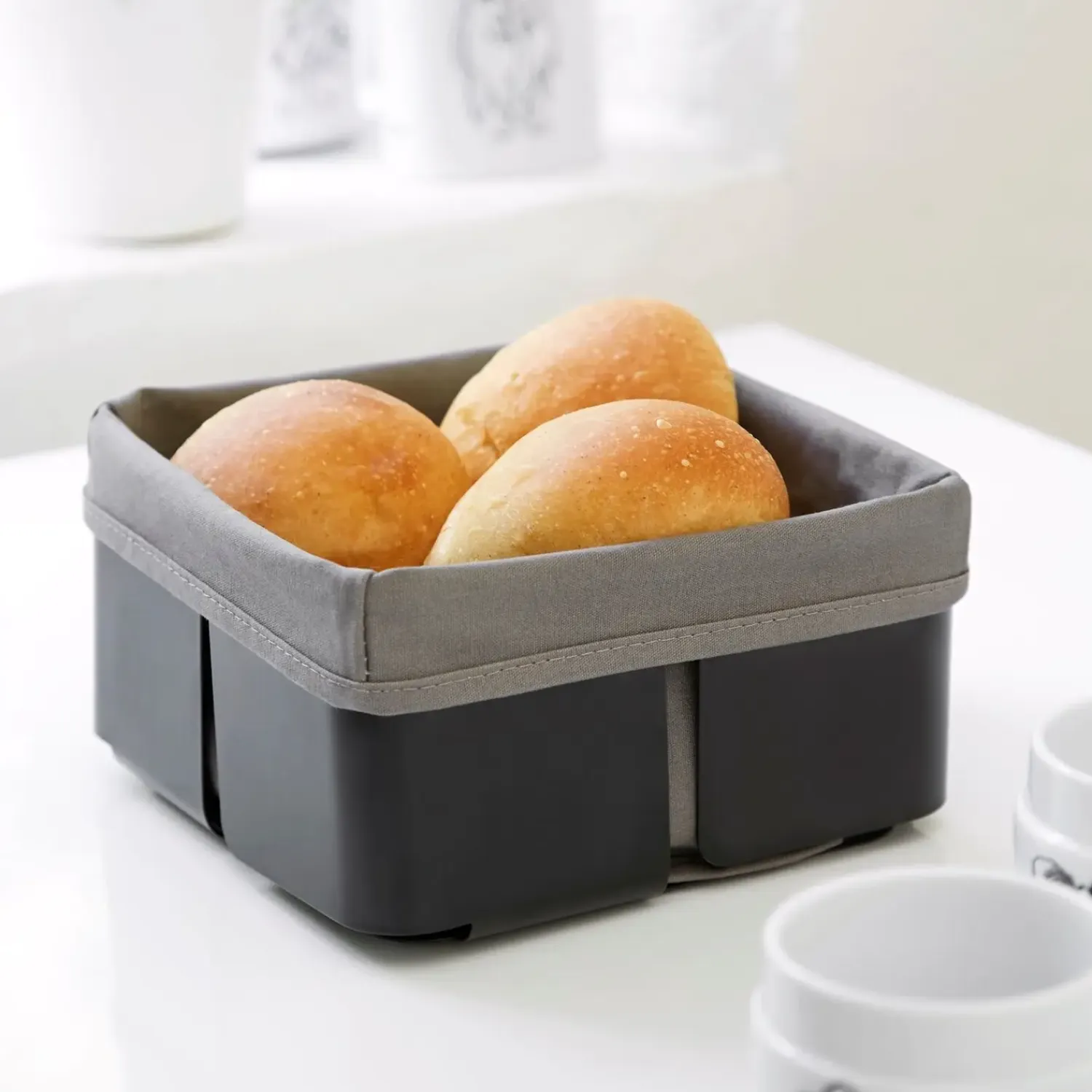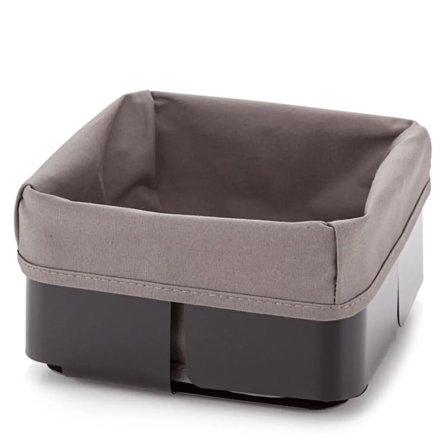Denne brødkurv kombinerer praktisk opbevaring med hverdagsfunktionalitet. Den aftagelige stofindsats i bomuld beskytter dit brød og gør rengøringen nem. Kurven er fremstillet i sort rustfrit stål med en grå udvendig beklædning.