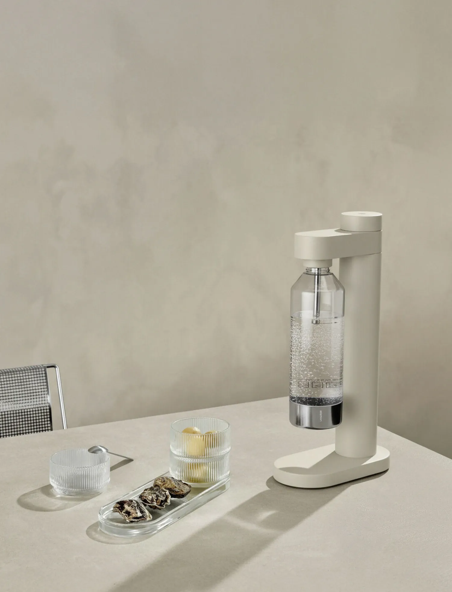 Med Brus kulsyremaskine sparer du miljøet for store mængder af unødigt plast ved at lave din egen danskvand eller sodavand i genanvendelige flasker. Designet af sodavandsmaskinen er så elegant, at du kan glæde dig over at have den stående fremme på køkkenbordet. Designeren bag, Søren Refsgaard er kendt for sit rene funktionelle design, hvor alt overflødigt er skåret væk. Det er Brus et særdeles godt eksempel på. Designet trækker på de cylindriske former, der er klassisk for Steltons design. Den cylindriske form ses først og fremmest i den ultraslanke beholder til kulsyrepatronen og går igen i kulsyreknappen, der intuitivt drejes med uret for at tilpasse mængden af kulsyre og drejes kontra, når flasken skal løsnes fra maskinen. Brus kulsyremaskine leveres med et styk Brus flaske.Brus kulsyremaskinen er kompatibel med de standardiserede, gevindløse 425g/60L CO?-patroner (M18 x 1,5), som fås i de fleste større supermarkeder og isenkræmmere. Kulsyrepatronen medfølger ikke. Ikke kompatibel med Quick-Connect-patroner eller patroner fra Australien.