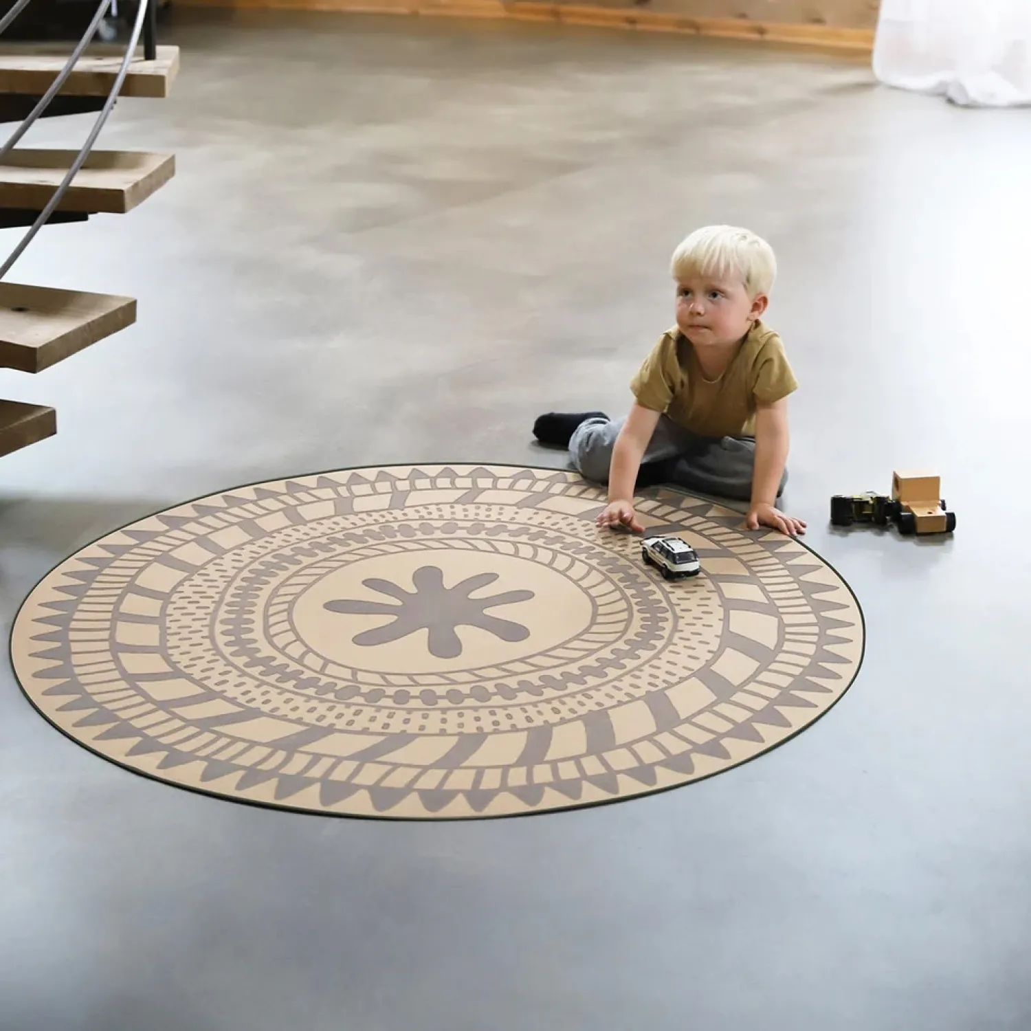 Den runde form på 130 cm i diameter giver plads til leg, mens det geometriske Raindance-mønster tilføjer et visuelt element til rummet. Legetæppet kan placeres direkte på gulvet og fungerer både som legeområde og som en del af indretningen, der passer til forskellige stilarter.