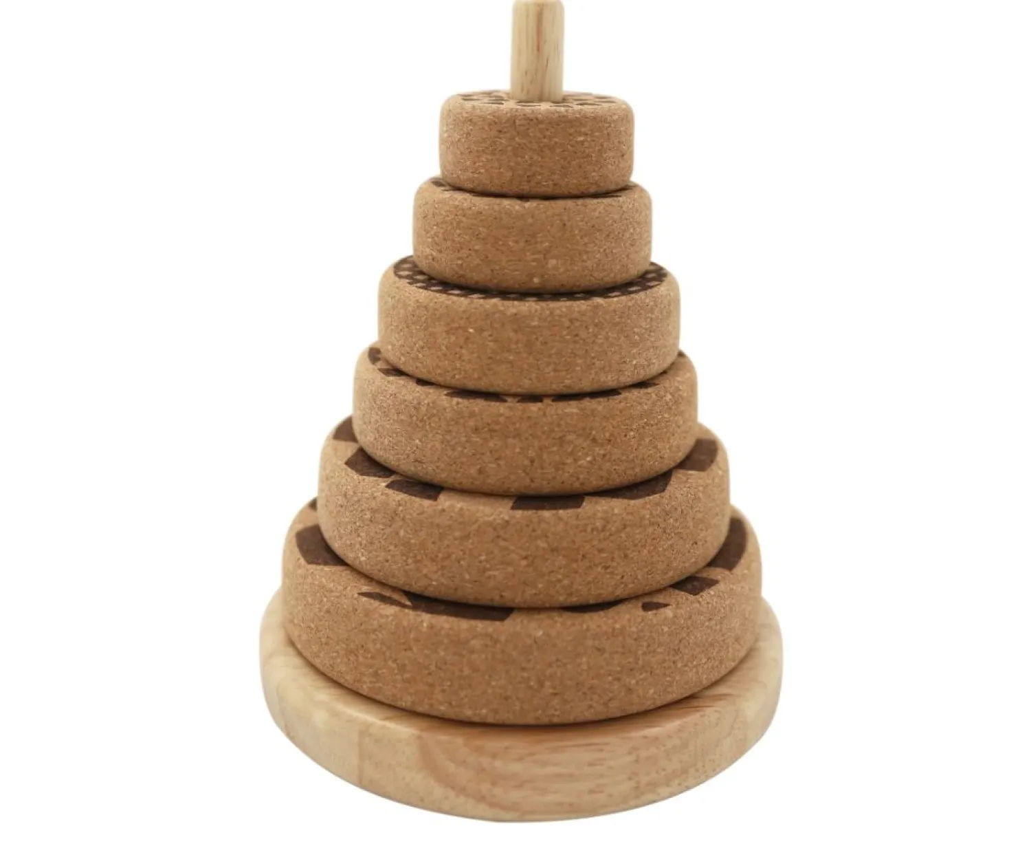 Dette stablingstårn er lavet af kork – et naturligt materiale, der er let, holdbart og blødt. Kork giver en behagelig haptisk oplevelse for små hænder og er et sikkert valg til børnelegetøj. Tårnet måler 12 cm i højden og 16 cm i længden, hvilket gør det håndterbart for børn.