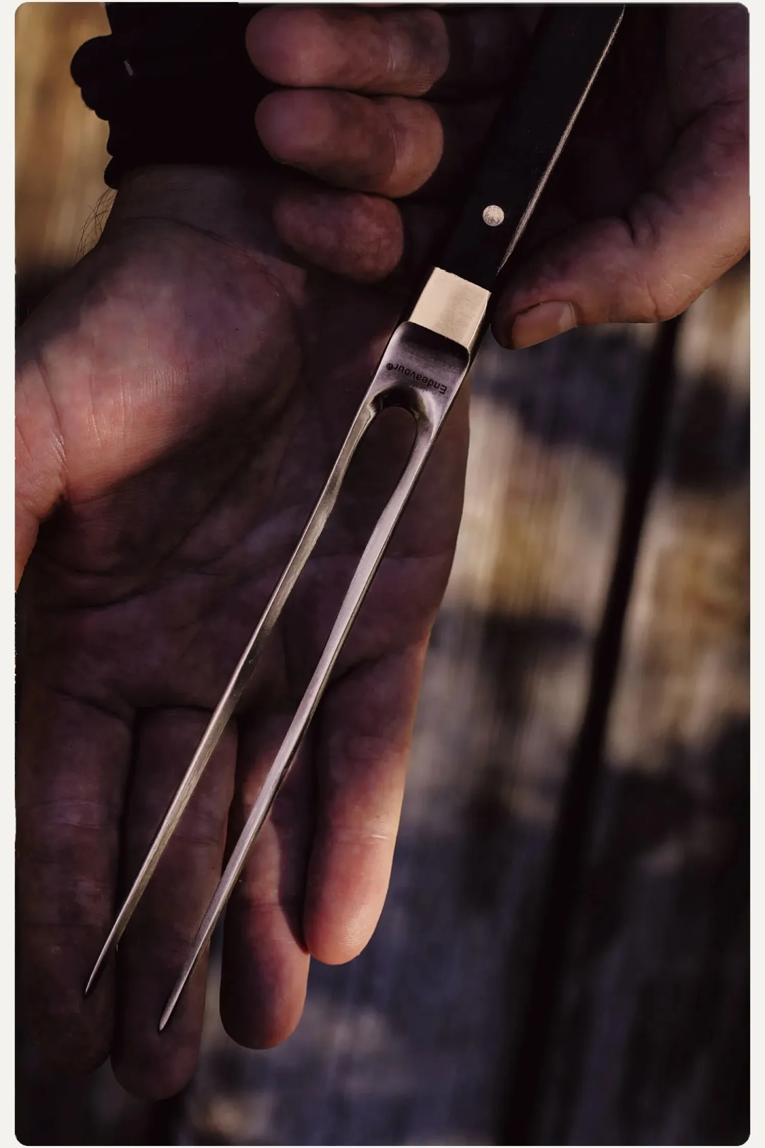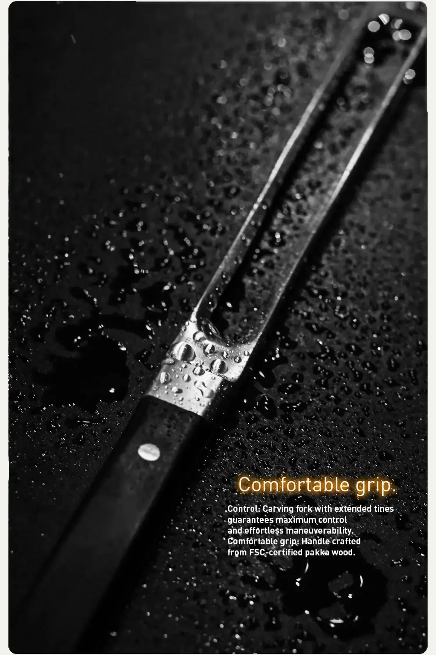 Stegegaffelens ergonomiske håndtag i pakka-træ ligger godt i hånden og giver et komfortabelt greb. Dette reducerer træthed i hånden ved længere tids brug og gør det lettere at styre redskabet præcist. Ergonomien er afgørende for effektivitet og komfort i køkkenet.
