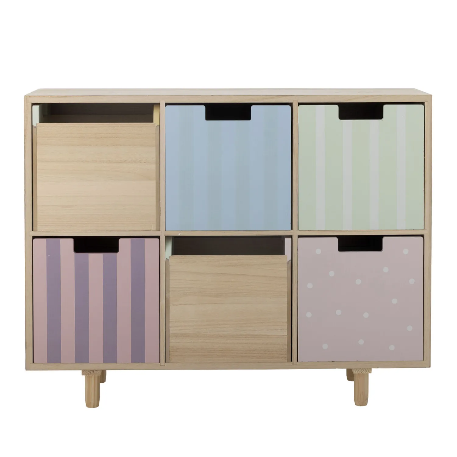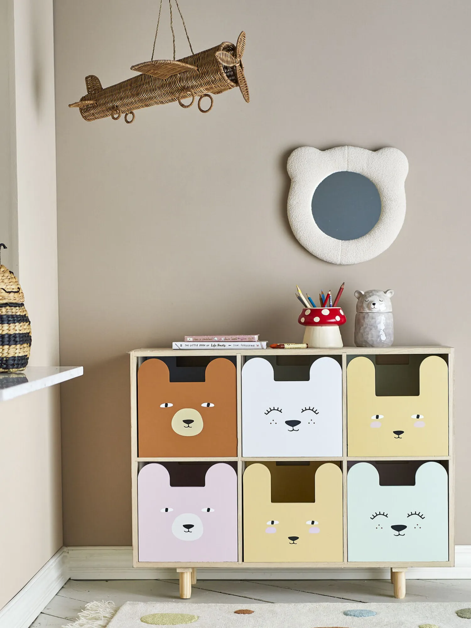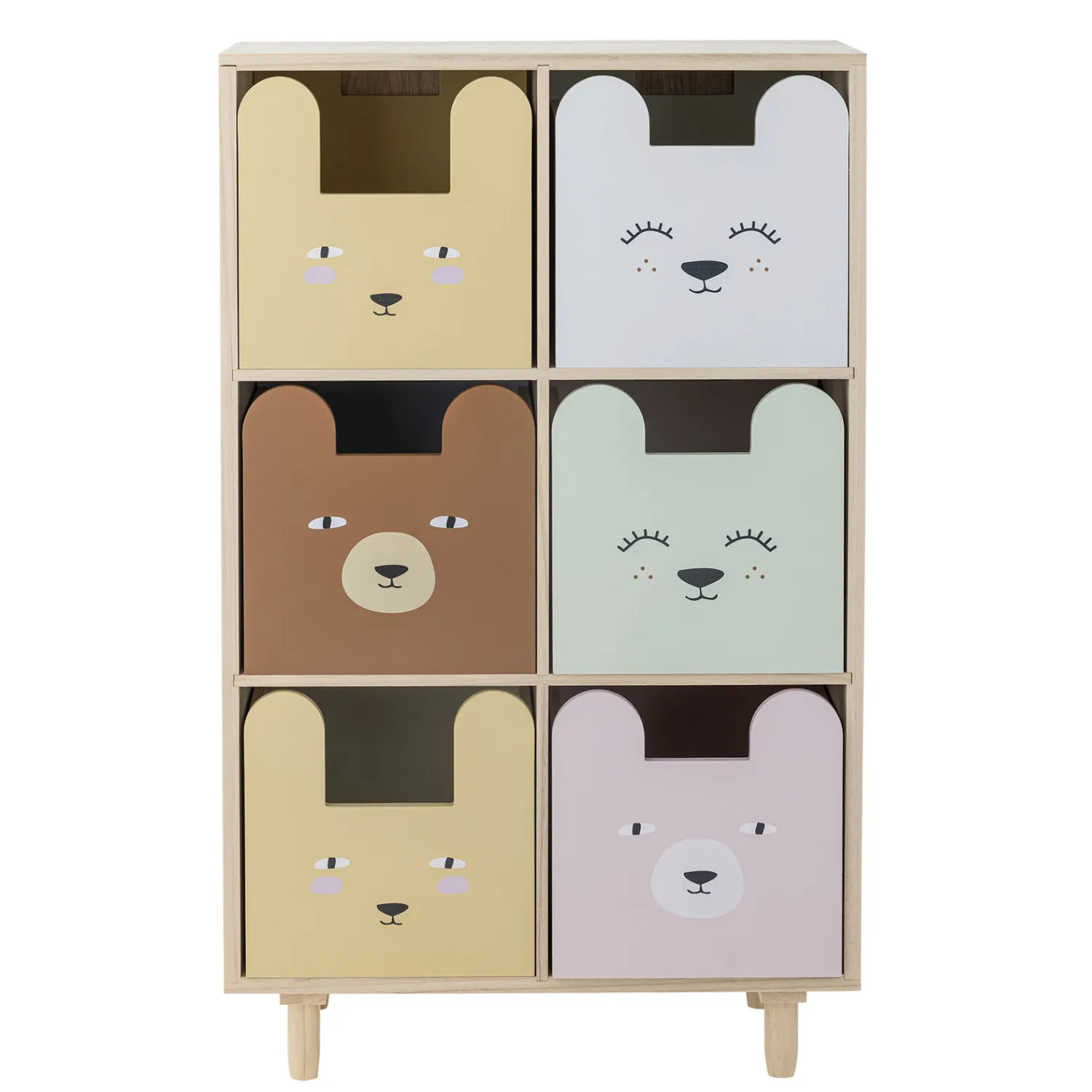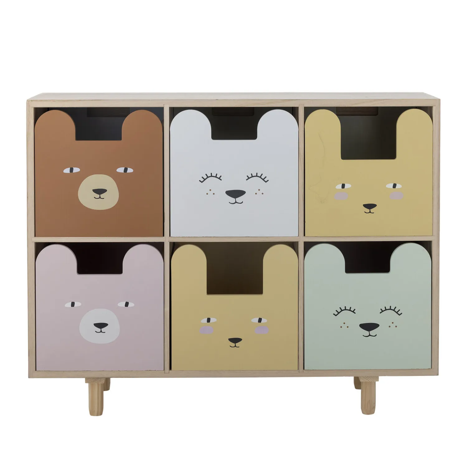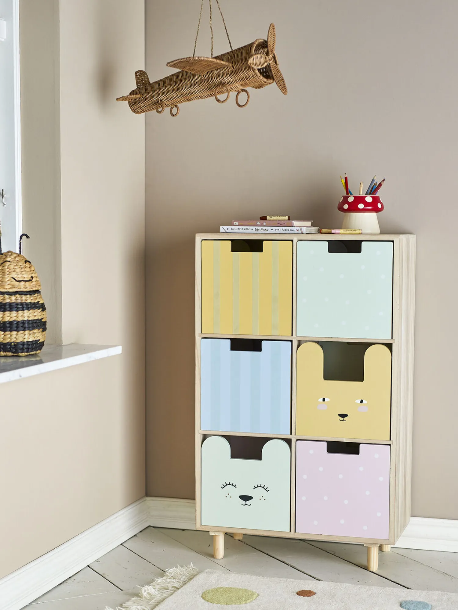 Denne reol med seks vendbare skuffer giver dig mulighed for at skifte mellem sjove dyreansigt og rolige mønstre i pastelfarver. Du kan placere reolen både lodret og vandret, så den passer præcist til dit rum.