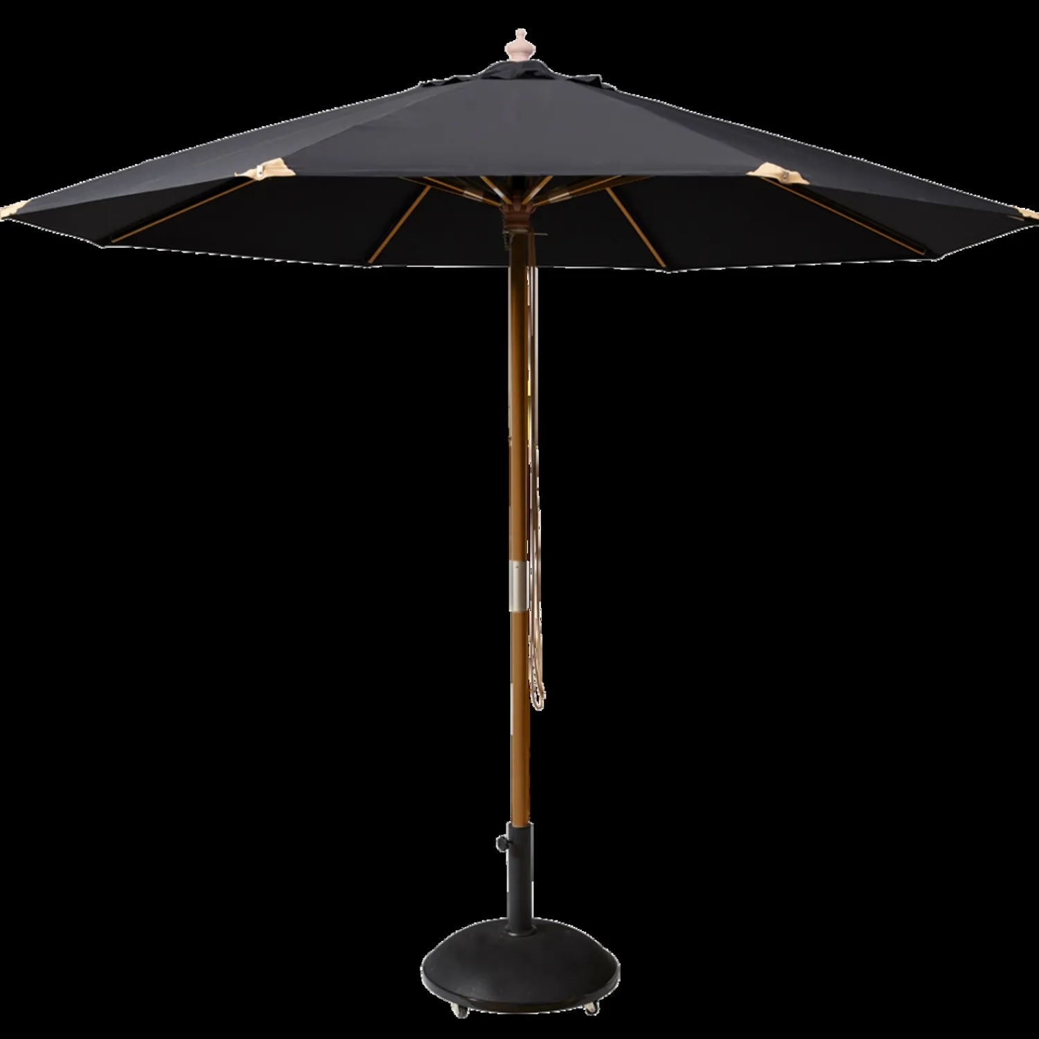 Capri-parasollen er konstrueret med fokus på funktionalitet. Den teakfarvede træstang giver støtte, mens den sorte polyesterdug dækker et område på 3 meter i diameter. Detaljer som L-clips og læderlapper bidrager til parasollens udseende.