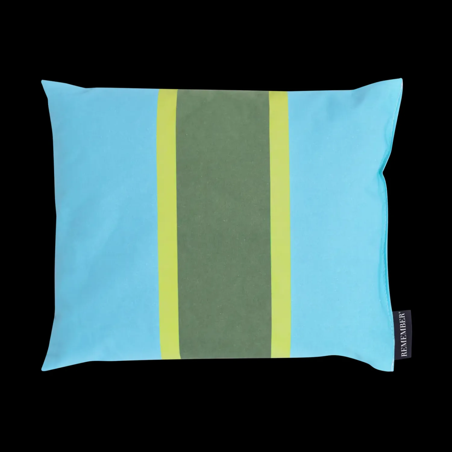 Pudens fleksibilitet gør den ideel til forskellige situationer, fra at lindre ømme muskler til at køle ned på varme dage. Det bomuldsbaserede betræk er behageligt mod huden og kan nemt vedligeholdes med en fugtig klud, hvilket sikrer langvarig brug og hygiejne. Designet omfatter en lys baggrund med en central stribe flankeret af to kontrasterende striber, hvilket gør puden til et dekorativt element i hjemmet.