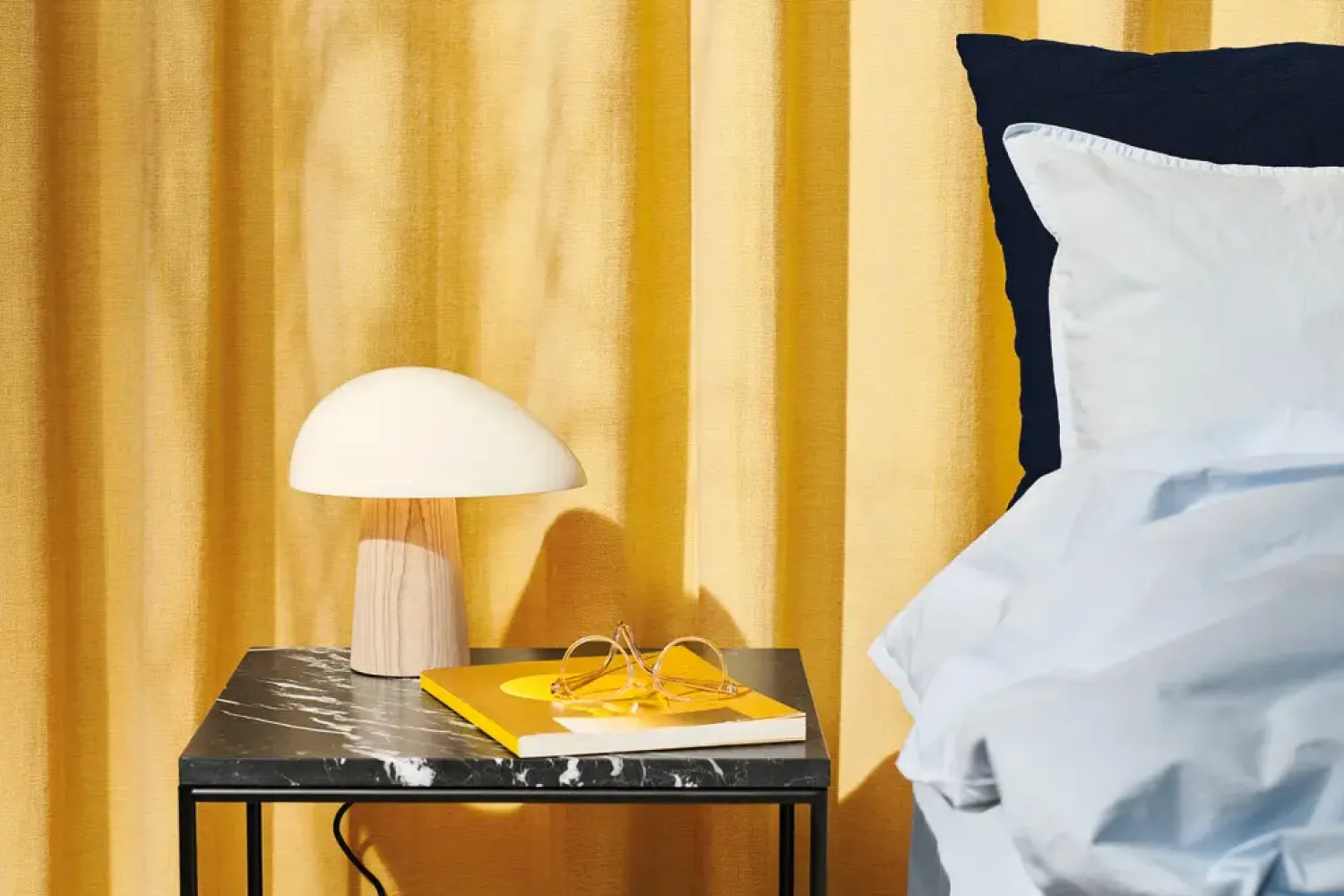 Den lyse, marmorerede overflade giver en naturlig variation i farve og struktur, så hvert bord er unikt. Marmor kræver omhu – undgå sure væsker, og tør straks spild op. Til gengæld får du en overflade, der tilfører karakter og holder i mange år.