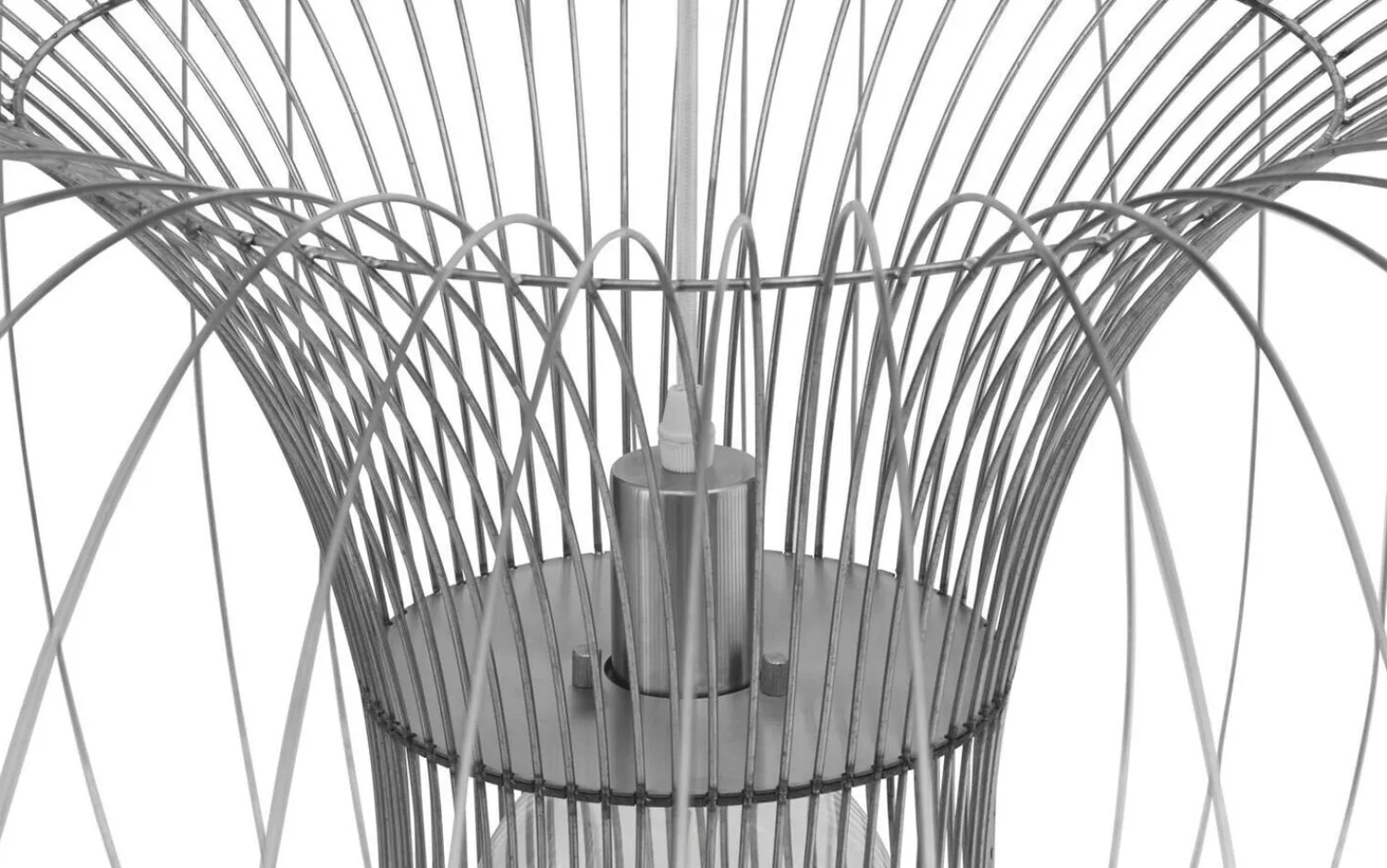 Denne loftlampe fra Normann Copenhagen er håndlavet af buede rustfrie ståltråde, der danner et åbent, cirkulært design. Med en diameter på 110 cm og en højde på 56,5 cm skaber den et markant udtryk i rummet.
