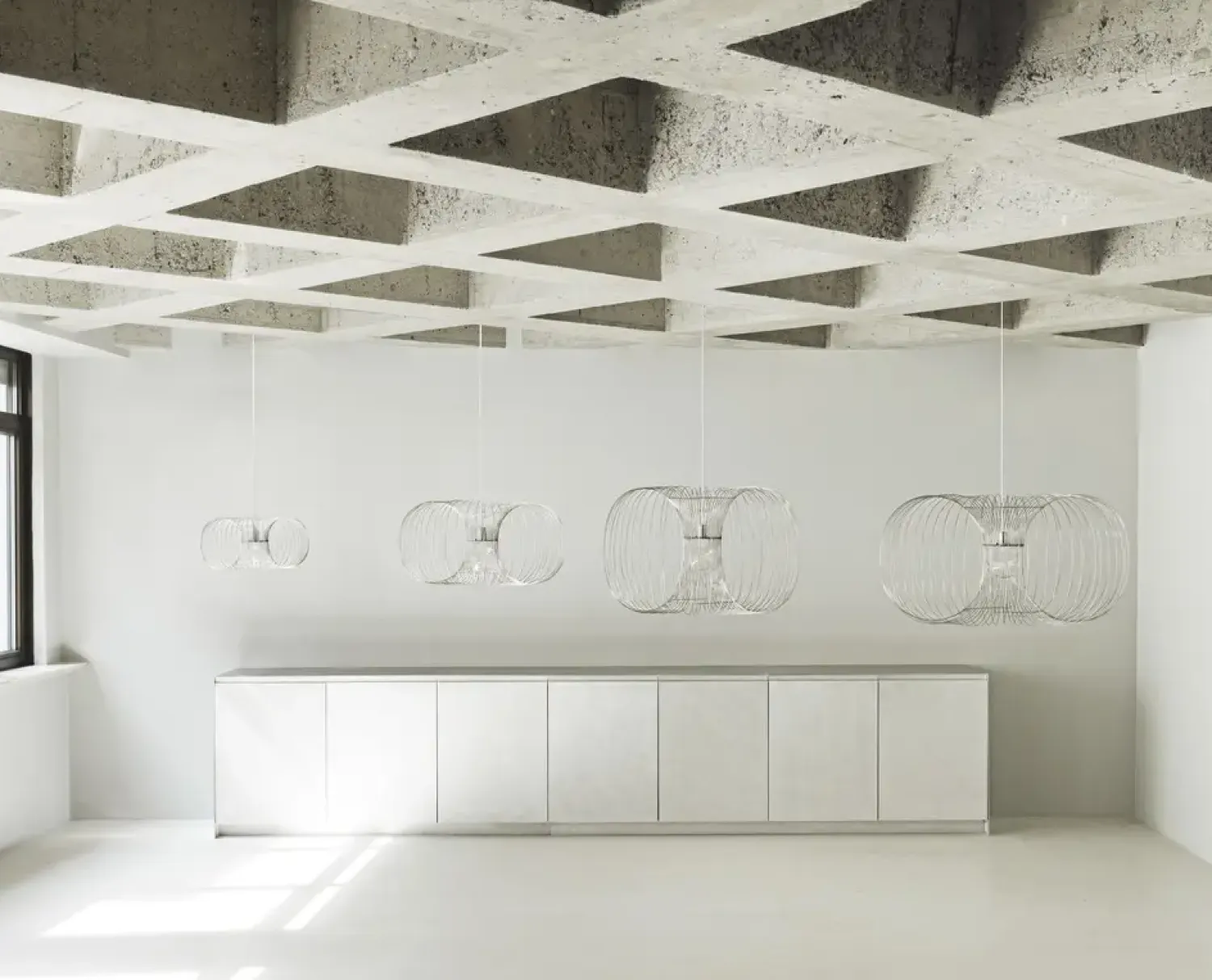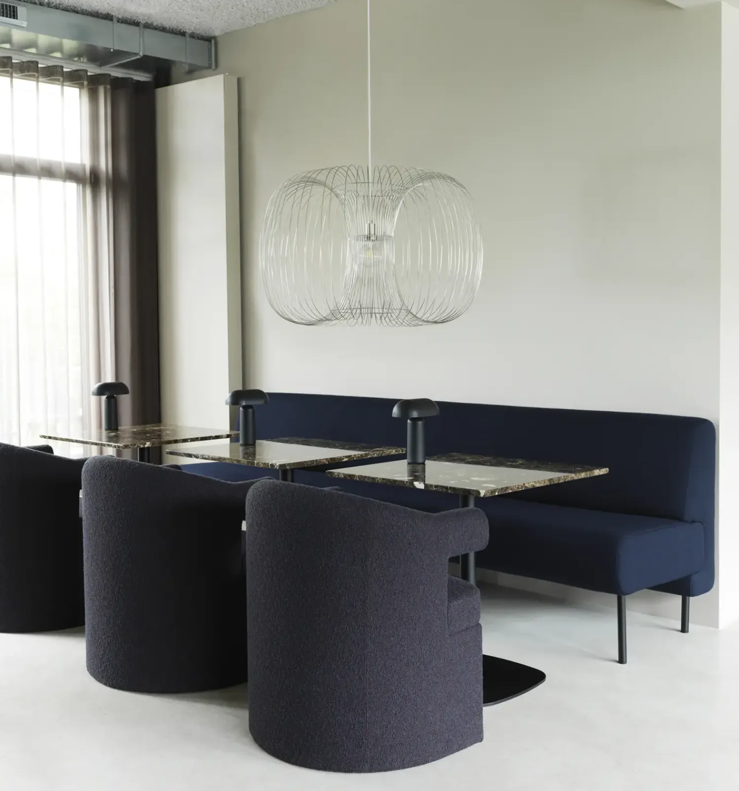 Med buede rustfrie ståltråde skaber denne hængelampe en let og luftig fornemmelse i rummet. Den symmetriske wireframe-struktur spreder lyset jævnt og skaber interessante skyggespil på væggene og loftet.