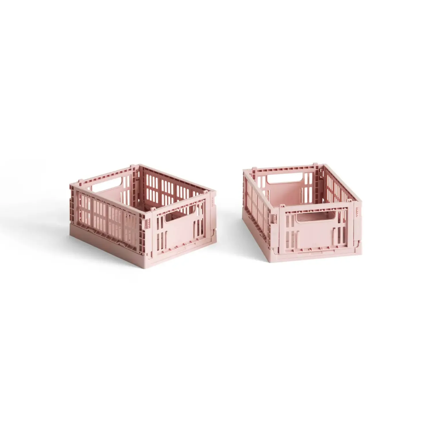 Praktiske opbevaringskasser fra HAY i blush-farve. To stabelbare kasser fremstillet af 100 % genanvendt plastik fra husholdningsaffald. Kompakt størrelse til organisering af mindre genstande.