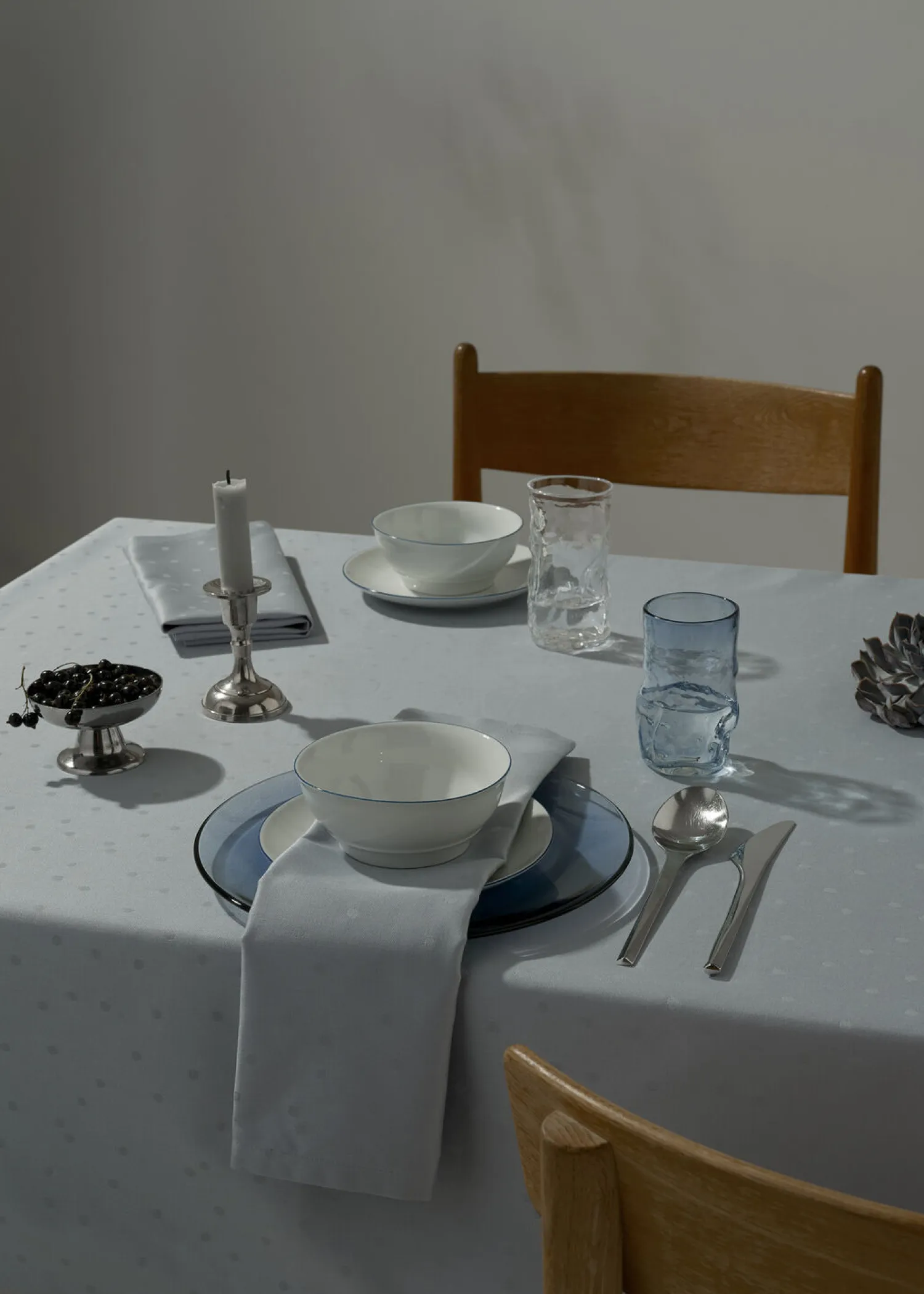 Denne damaskvævede dug i 100 % bomuld tilbyder både holdbarhed og en luksuriøs fornemmelse. Det diskrete prikkede mønster i mineralblå nuancer skaber en rolig stemning ved bordet, mens den glatte tekstur giver et professionelt udtryk.