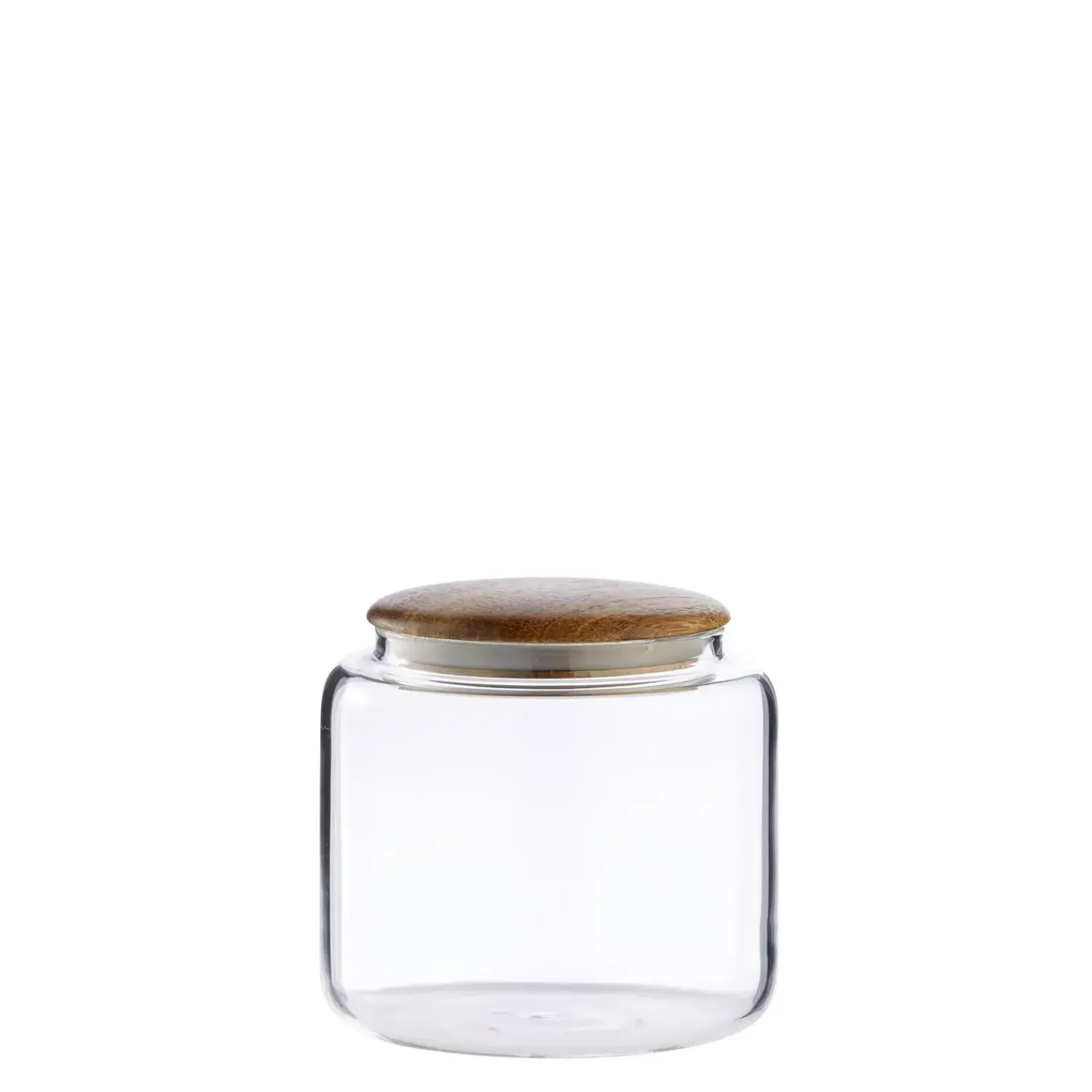 Enkel transparent krukke i glas med låg af acacietræ i farven natur.