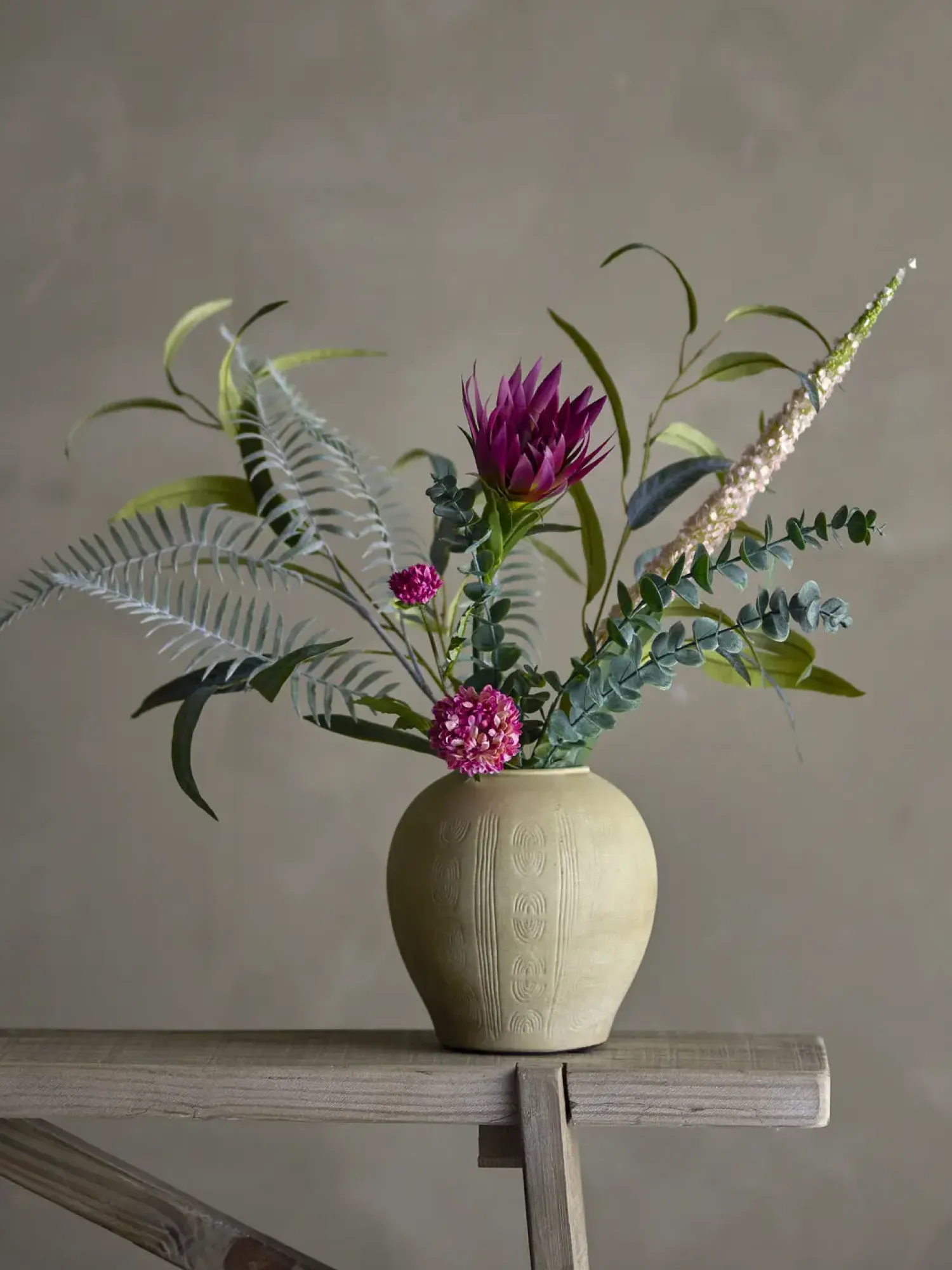 Buketten leveres klar til brug, men uden vase. Håndter blomster og blade med omhu for at bevare deres form. Den kunstige buket er ideel, hvis du ønsker en langtidsholdbar dekoration uden vedligeholdelse.