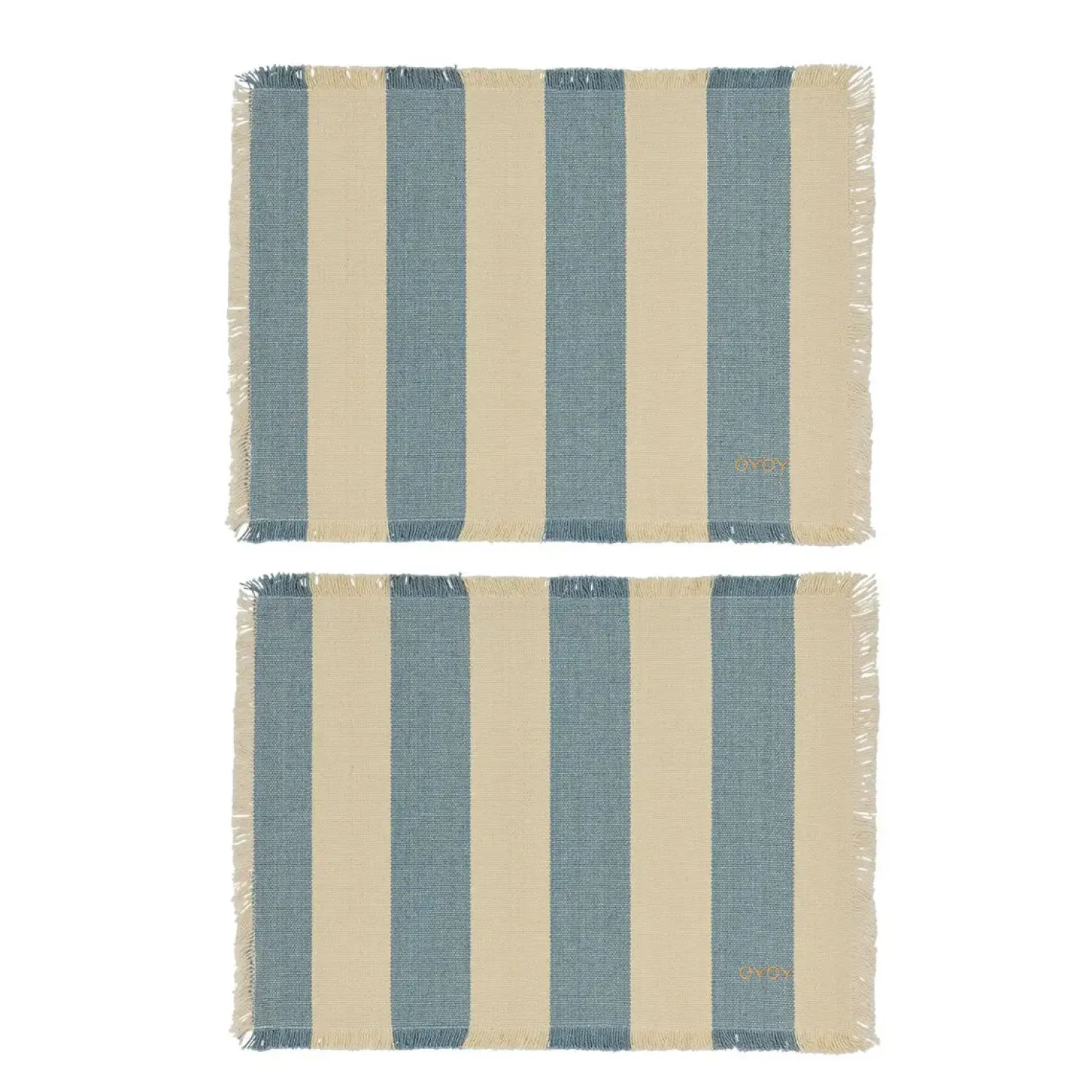 Du får et sæt med to matchende dækkeservietter i 100 % økologisk bomuld. De karakteristiske striber i lyseblå og beige skaber en rolig bordopdækning, mens frynserne tilfører et diskret designelement.
