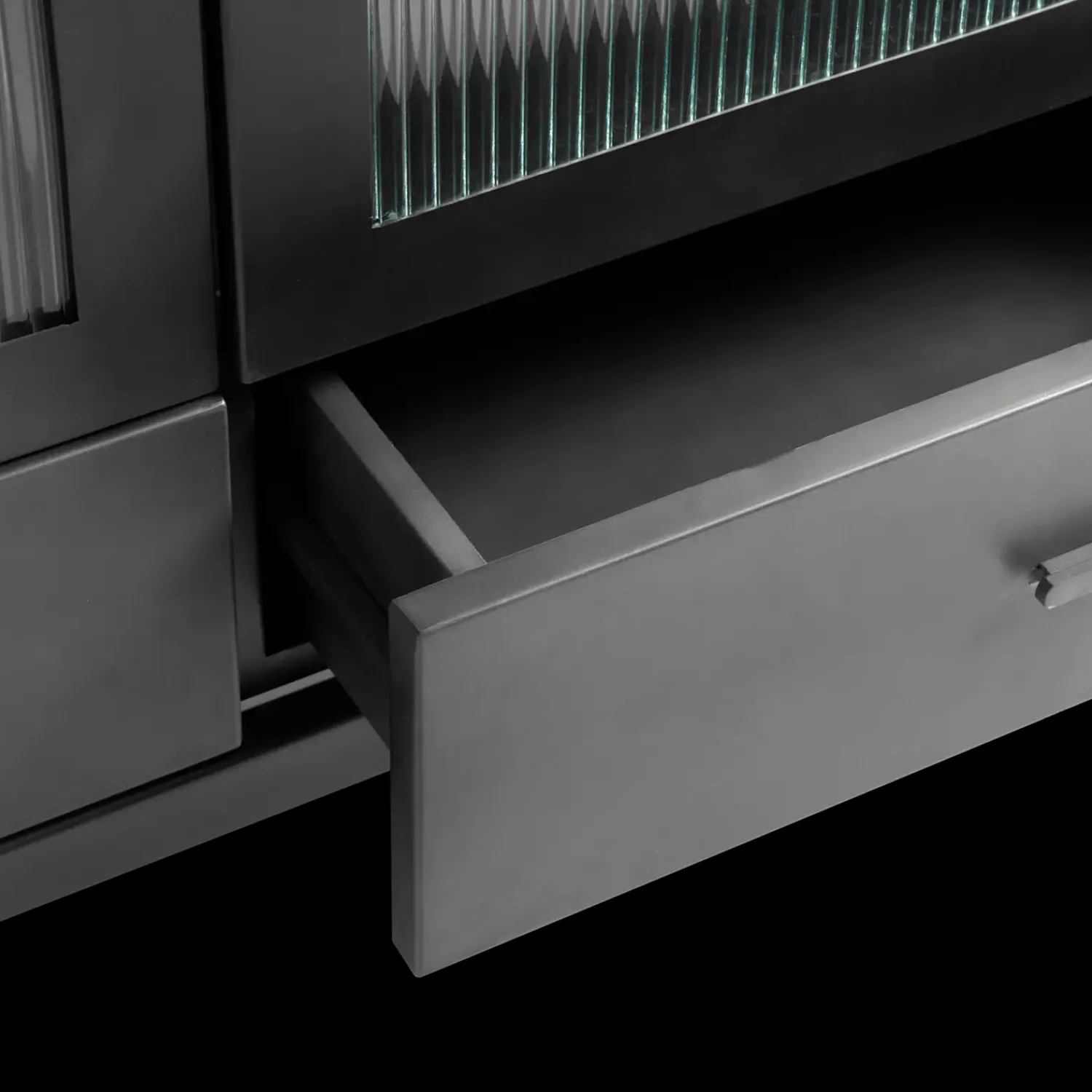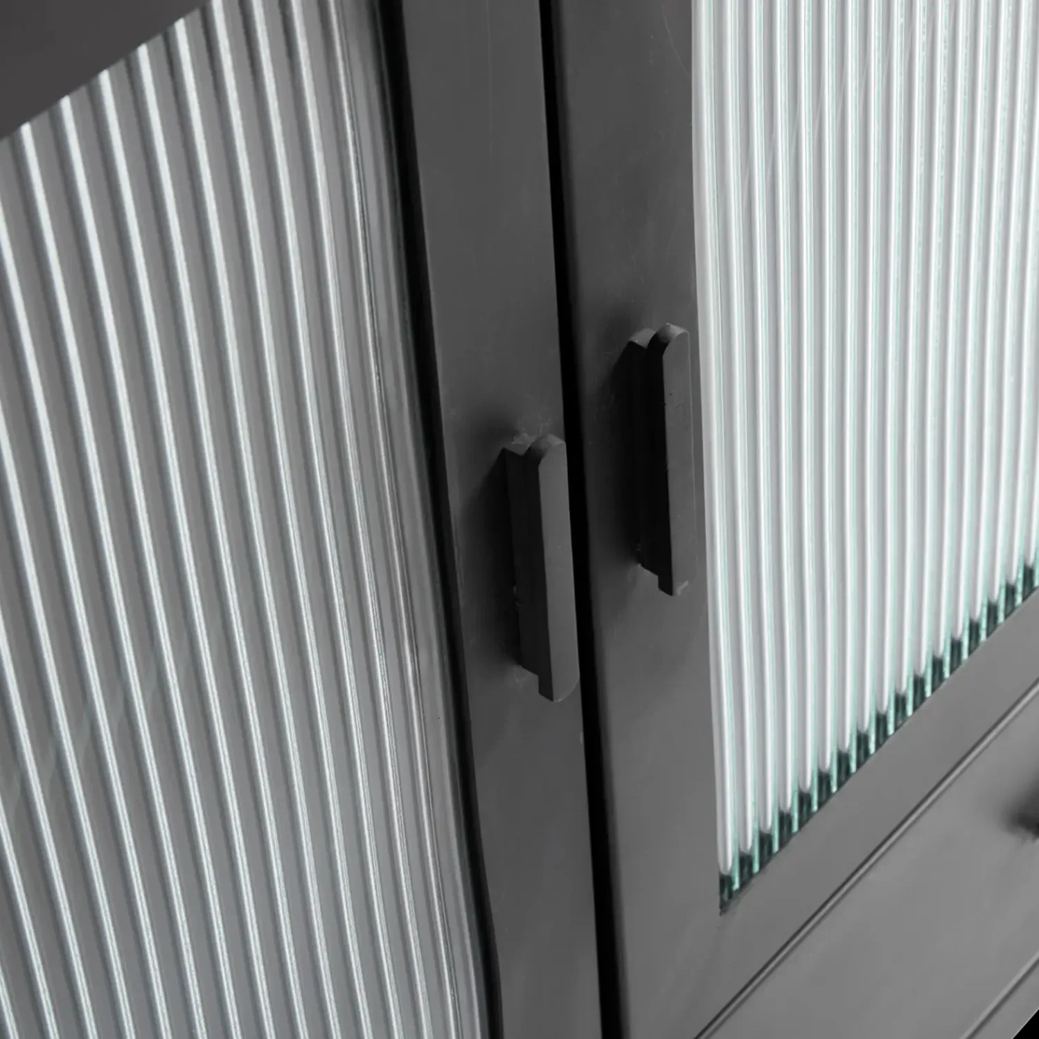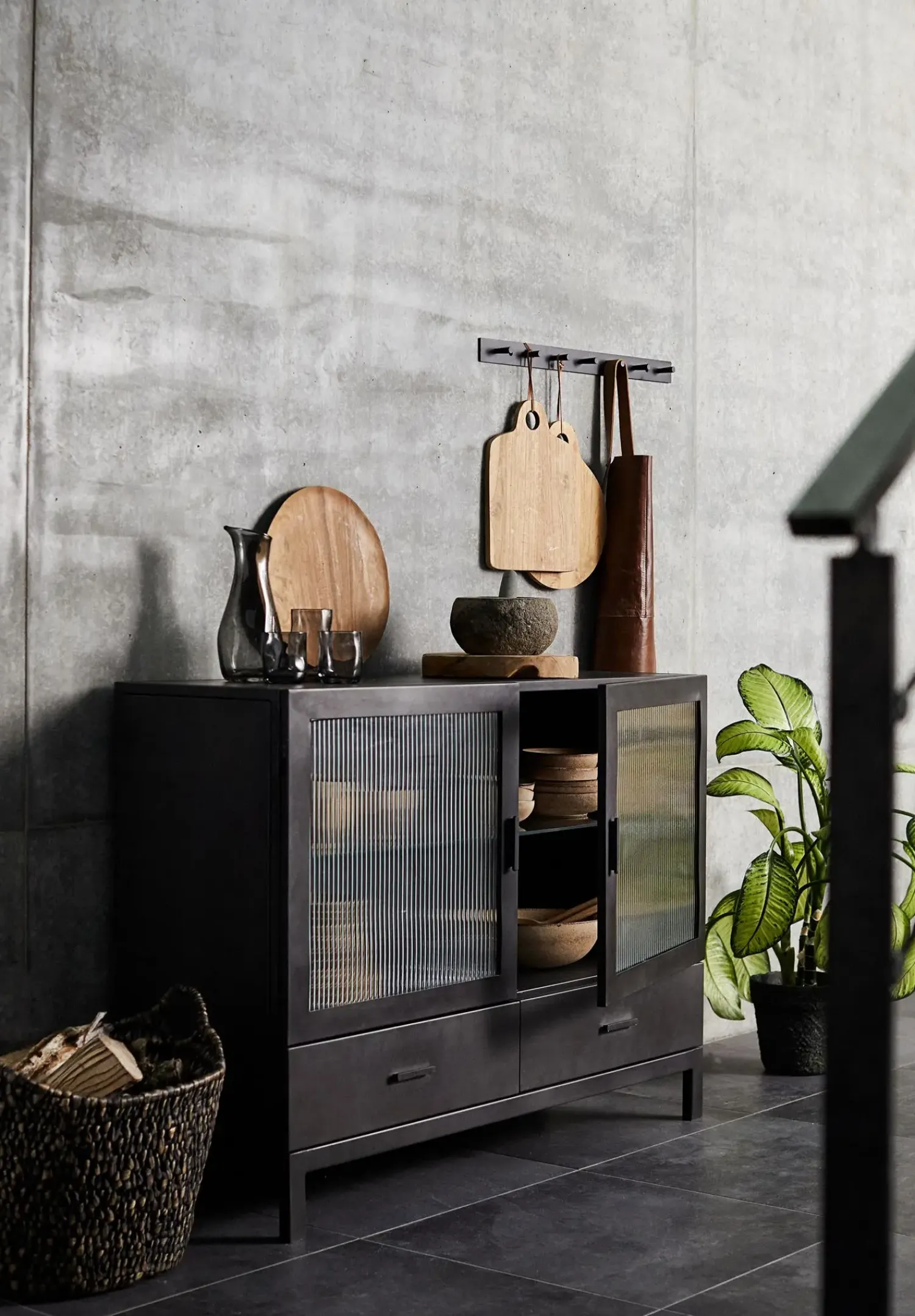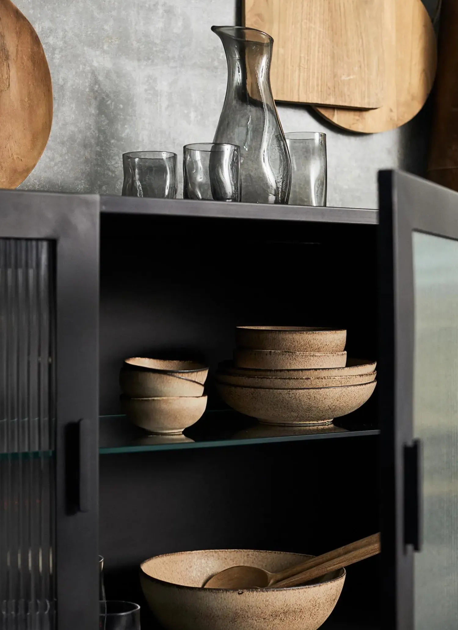 Muubs Dallas vitrineskab i sort er en praktisk opbevaringsløsning til hjemmet. Dette skab kombinerer et moderne design med funktionel opbevaring, hvilket gør det til et alsidigt møbel. De riflede glaspaneler i frontlågerne giver et distinkt udtryk, mens de magnetiske lukninger sikrer nem betjening.