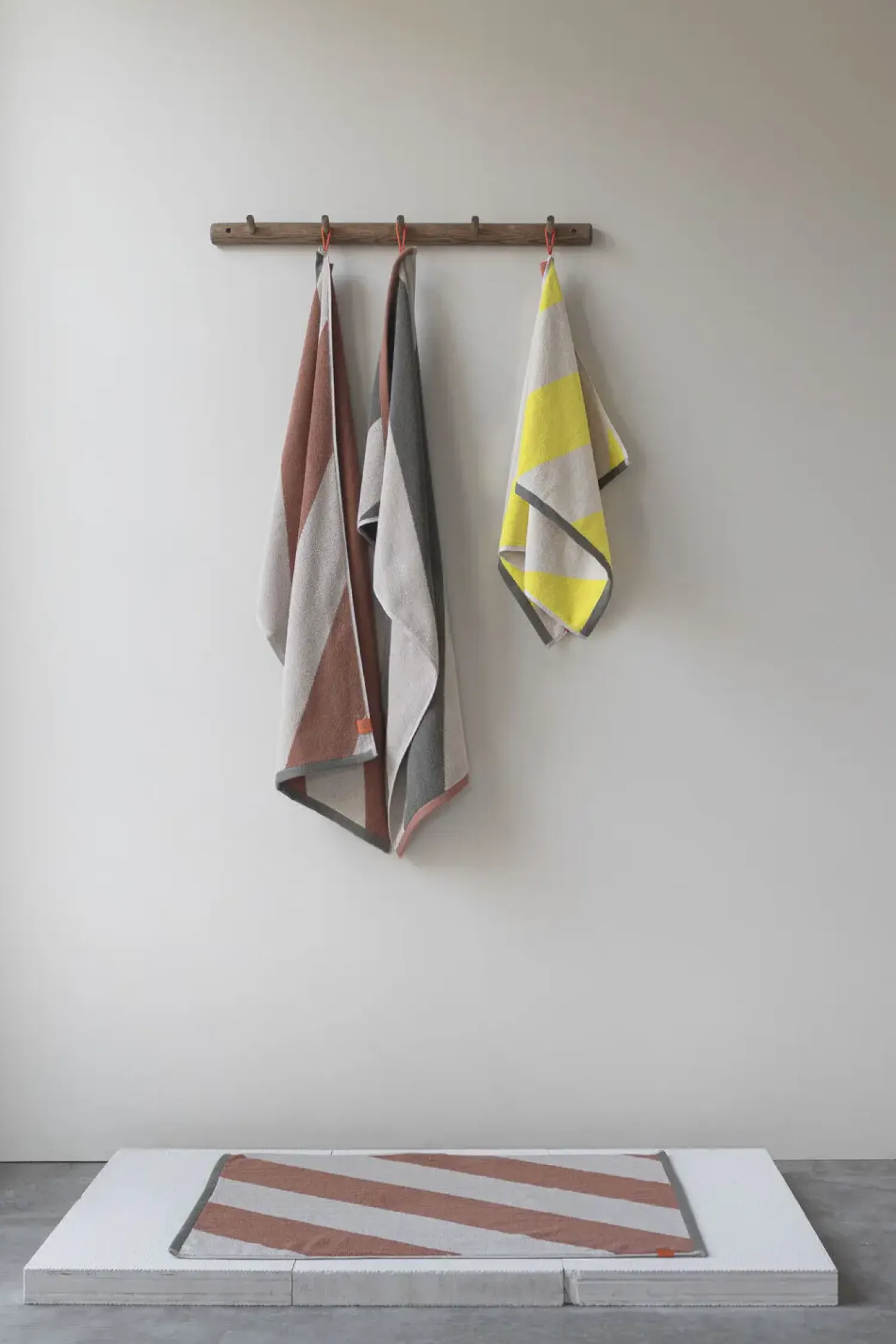 Giv dit badeværelse et farverigt og moderne udtryk med DIAGONAL-gæstehåndklædet fra Mette Ditmer. Med sine brede diagonale striber i gul og beige tilfører håndklædet et friskt og energisk look til rummet, mens en olivengrøn bort elegant indrammer designet. Den kontrastfulde orange strop og label fungerer som både en praktisk og dekorativ detalje, der understreger det legende design.DIAGONAL-håndklædet er OEKO-TEX® 100-certificeret og fremstillet af økologisk bomuld, hvilket giver høj kvalitet med en blød og absorberende overflade. Den langfibrede bomuld sikrer både holdbarhed og en følelse af luksus. Mix og match med andre farver i serien for at skabe et personligt og harmonisk badeværelse.For at opnå maksimal absorberingsevne anbefales det at lægge håndklædet i blød i koldt vand i 24 timer inden første vask. Undgå skyllemiddel for at bevare håndklædets optimale kvalitet.