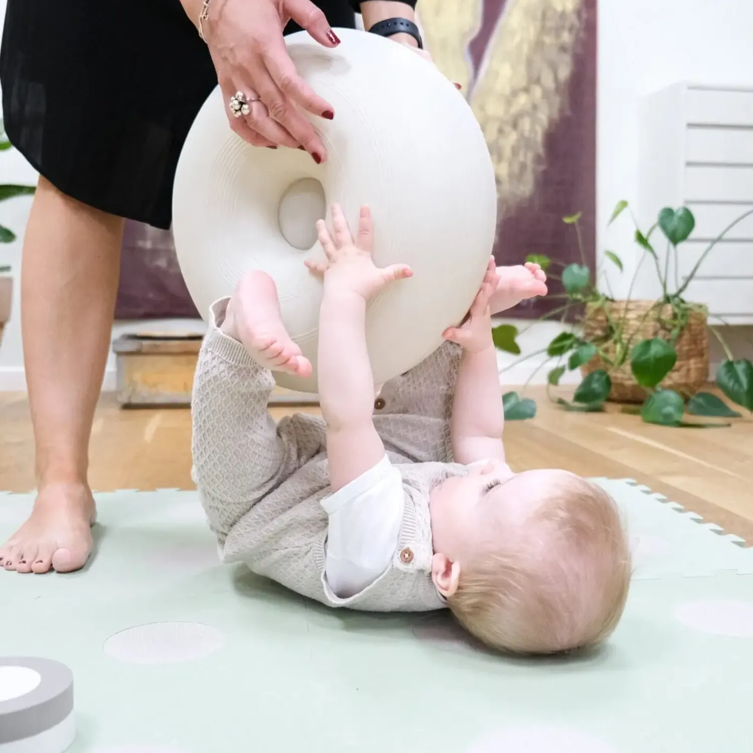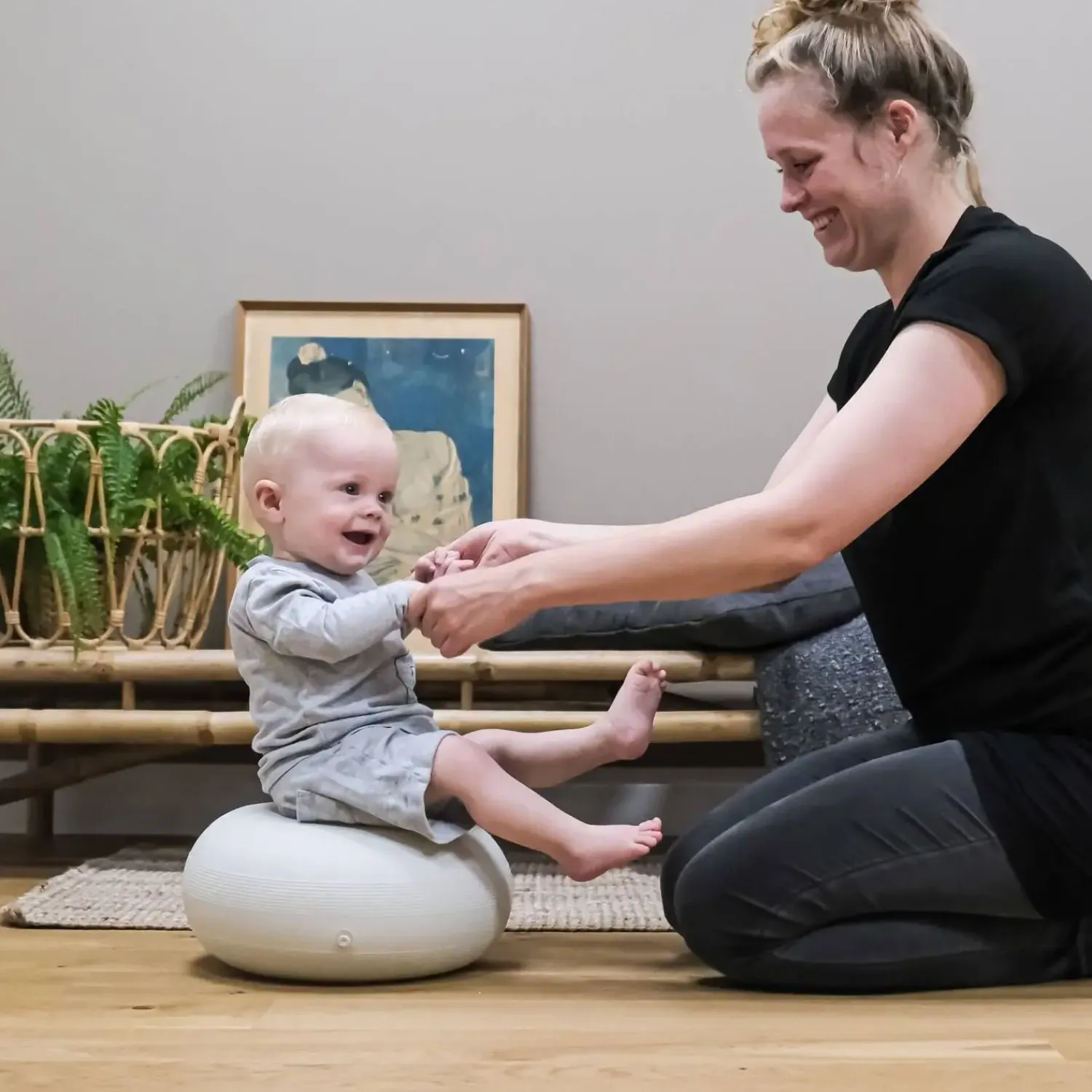 Man kan ikke lade være med at smile, når man hopper. Det er en af livets smukke sandheder. Og alene af den grund bør alle børn og barnlige sjæle eje en Donut.bObles Donut findes i tre størrelser, så der er en til alle medlemmer i familien. Men bare fordi man er stor, skal man ikke nødvendigvis have den store Donut. Mor og far vil med garanti nyde den bevægelse og koncentration, der følger med at lægge den lille Donut på en skammel eller stol. Ligesom baby vil klukke af lykke, når der bliver trænet nakke og ryg på en mellem Donut.Sæt Donut på højkant og pludselig har alle familiemedlemmer det sjoveste hoppedyr. Baby vil elske at sidde på skødet af forældrene, mens de hopper rundt på den store Donut. Ligesom det vil være en sanserejse, der både stimulerer vestibulærsansen, muskelledsansen og følesansen, når baby bliver gynget frem og tilbage og fra side til side på Donut, mens der en gang imellem bliver slået i siden på den, så baby kan mærke vibrationerne i den elastiske gummi.Trykkes den elastiske Donut ned i gulvet, dannes et vakuum, så den står fast, og har man to eller flere, kan de sættes ovenpå hinanden. Donut kan også laves om til gynge ved tilkøb af en bObles gyngedel til Donut.