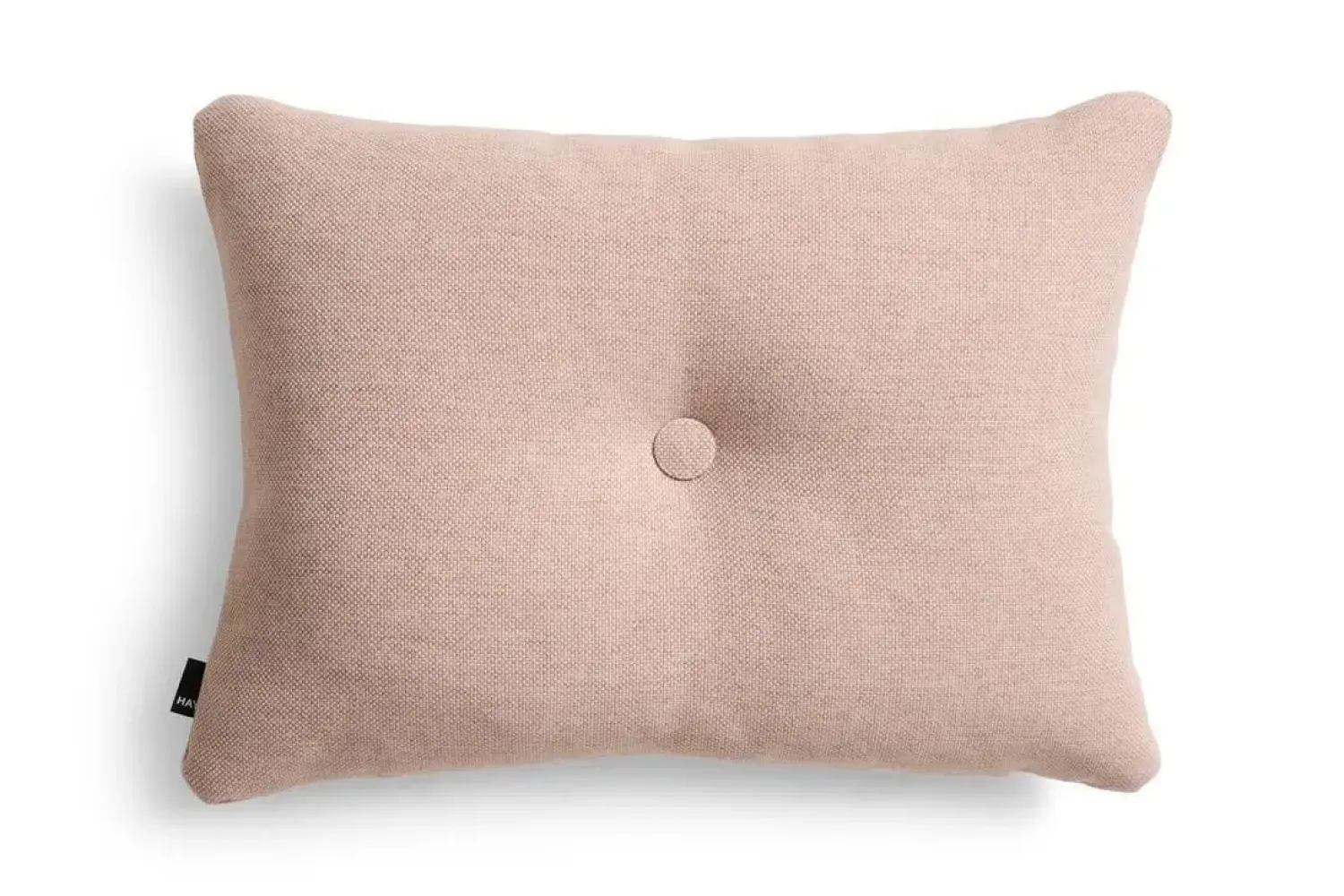 Denne rektangulære pude fra Hay kombinerer en blød lyserød nuance med en vævet overflade. Den centrale knap skaber et karakteristisk udtryk, mens materialevalget med 80 % genanvendt polyester sikrer holdbarhed i hverdagen.