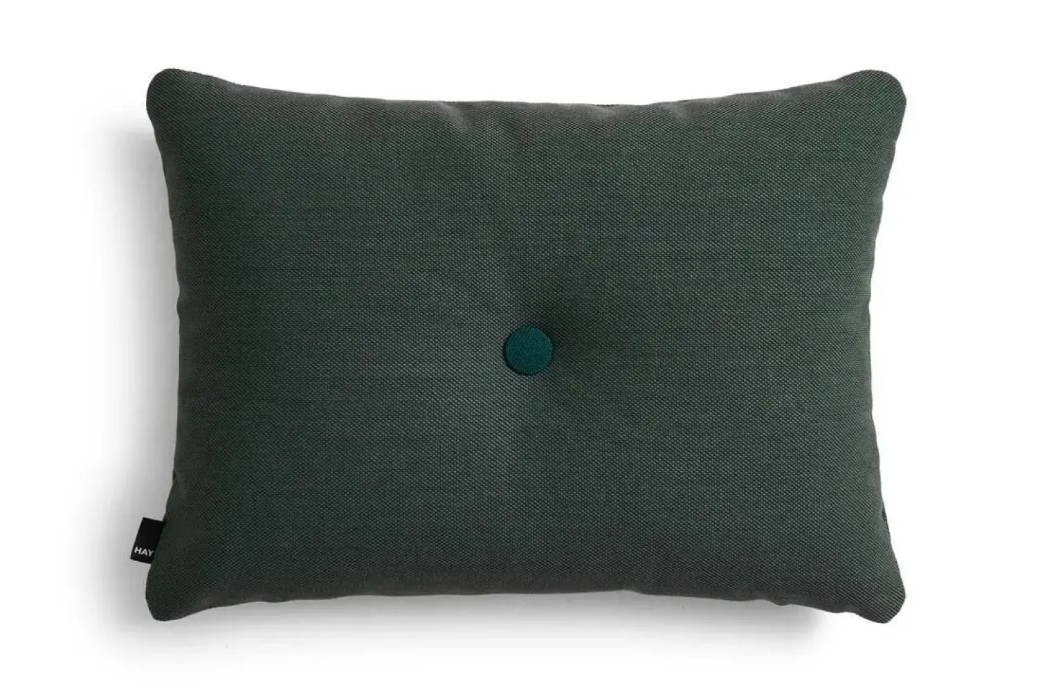 Du får en rektangulær pude i Steelcut Trio-stof, som kombinerer 90 % uld og 10 % nylon. Den grønne farve og den karakteristiske knap i midten skaber et enkelt udtryk, der passer ind i din indretning.