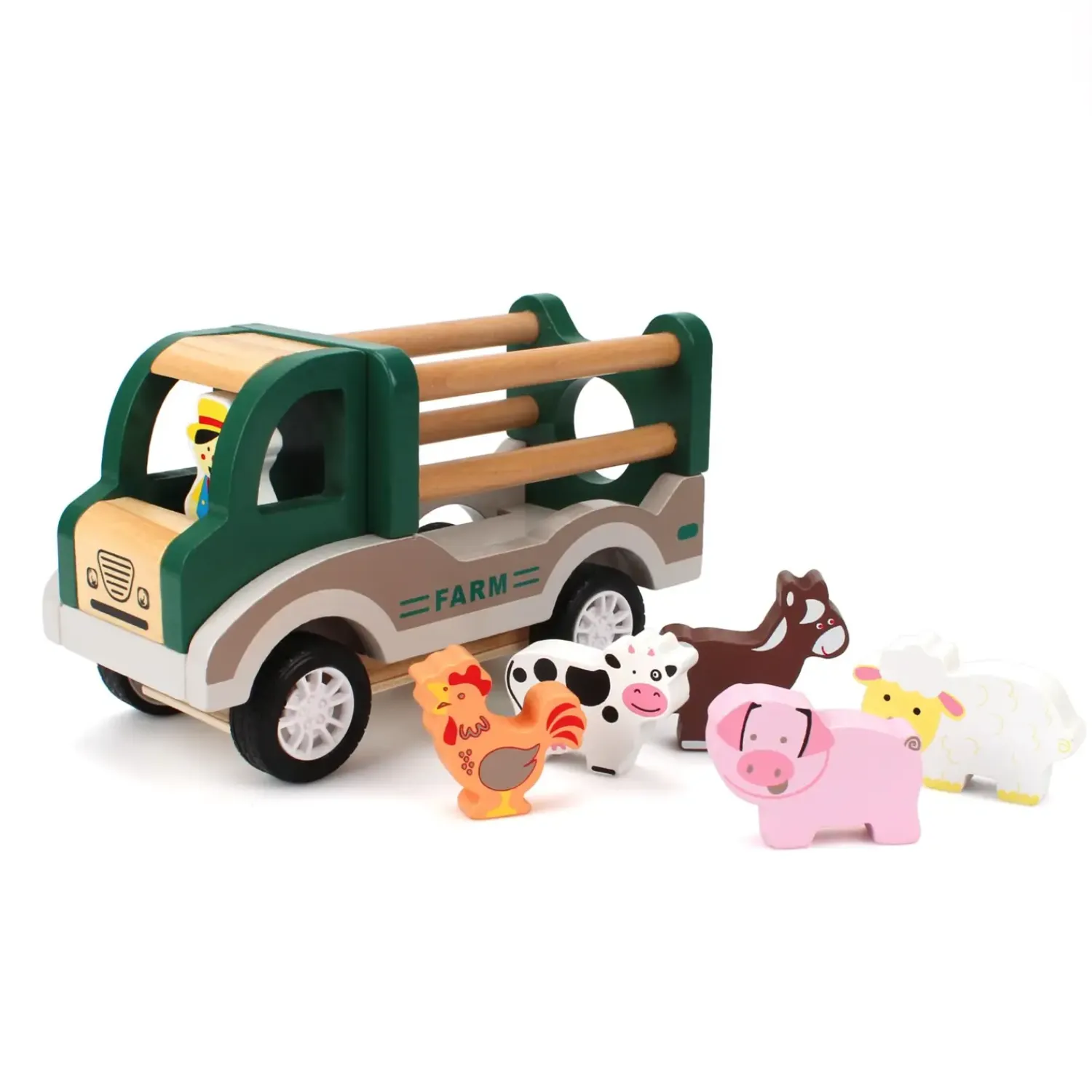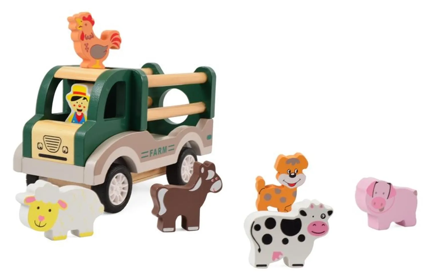 Dyretransport Bil med 6 Bondegårdsdyr fra Magni. Bilen kan have både hund, gris, hane, køer og får med i bilen. Bilen er udstyret med gummihjul for en glidende kørsel og har en pull-back funktion, der giver ekstra sjov, når bilen hurtigt trækker sig tilbage og bevæger sig fremad. Det er både en lærerig og underholdende måde for børn at udvikle deres finmotorik, samtidig med at de lærer om dyrene på gården.