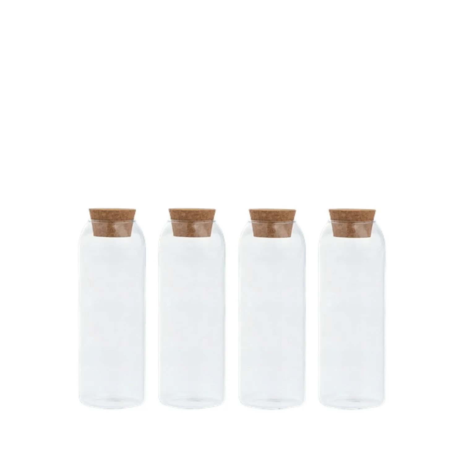 Disse krydderikrukker er lavet af kork og glas, hvilket bringer naturlige materialer ind i dit køkken. Sættet indeholder fire krukker, der måler 5 x 14 cm hver, og giver dig en praktisk løsning til opbevaring af krydderier og tørre ingredienser.
