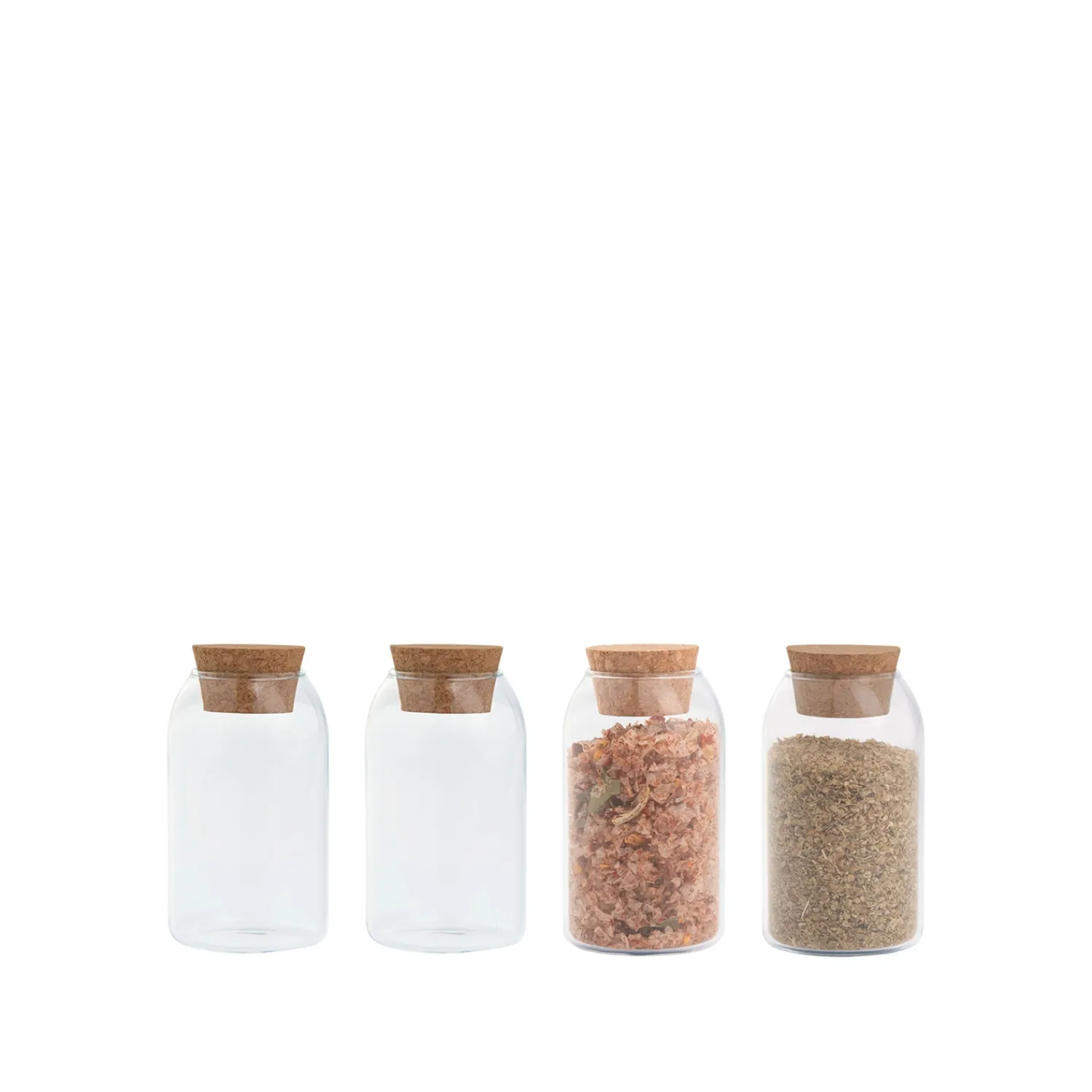 Disse krydderikrukker kombinerer glas og kork til en funktionel opbevaringsløsning. Glasset giver dig mulighed for at se indholdet med et blik, mens korklågene sikrer en tæt forsegling, der holder dine krydderier friske længere. Sættet inkluderer fire krukker, så du kan organisere flere krydderier på én gang.
