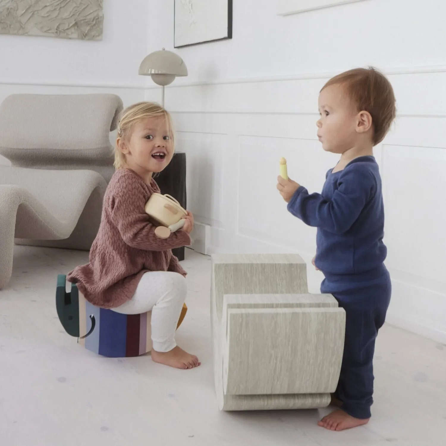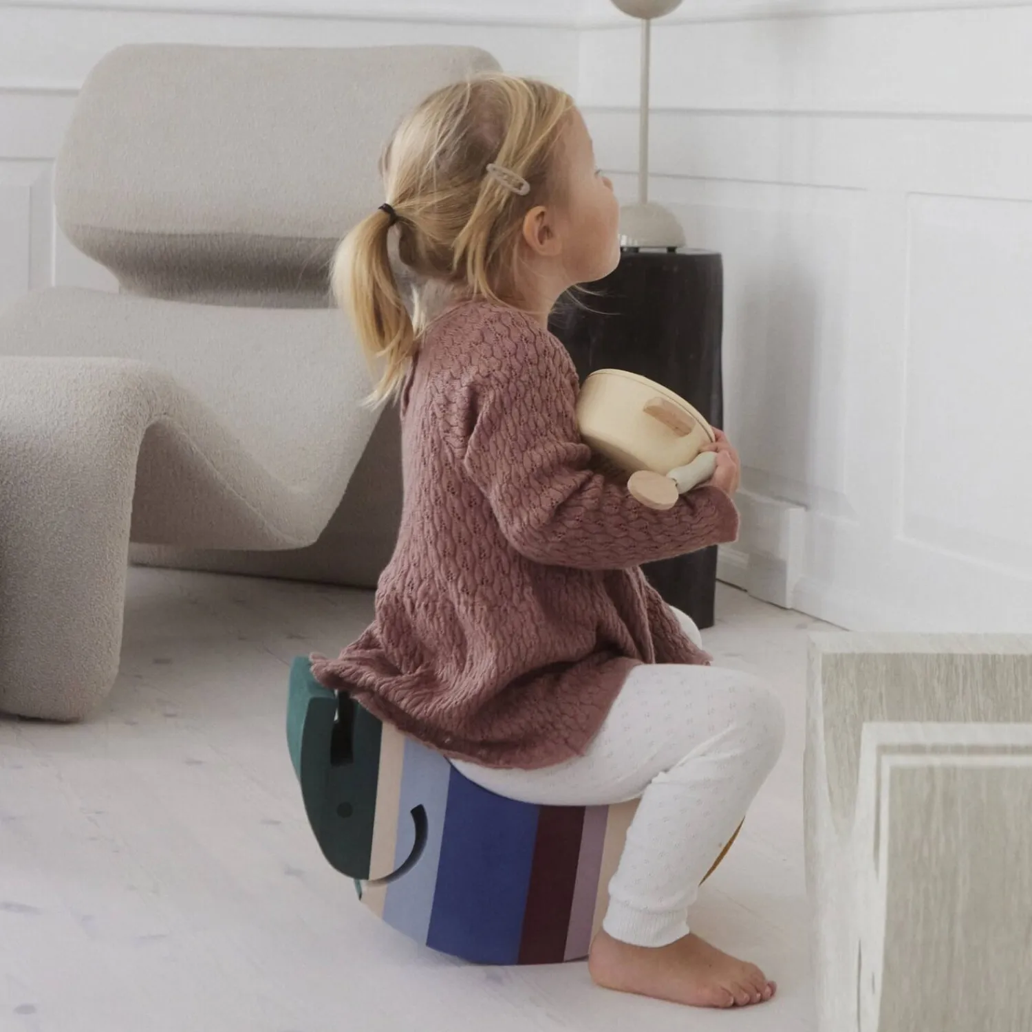 bObles Elefant i størrelse S er et alsidigt og elsket tumlemøbel til børn i alle aldre. Den understøtter barnets motoriske udvikling fra de allerførste måneder og gennem hele barndommen.Den lille baby kan ligge hen over Elefantens bløde runding og styrke nakken eller placeres i maven på Elefanten og vugge frem og tilbage – en skøn måde at stimulere ryg og vestibulærsans. Når barnet skal lære at rejse sig og gå, er Elefanten det perfekte møbel at støtte sig til: Den skridsikre og bløde overflade beskytter både barn og gulv.Elefantens styrke ligger i dens mange anvendelsesmuligheder. Den fungerer som stol, vippebræt, gyngehest og skammel – og er et uundværligt element i alt fra tandbørstning til tumlebaner og bollebagning. Den ikoniske form og tidløse æstetik gør den smuk i både børneværelse og stue, og det slidstærke EVA-skum sikrer, at Elefanten holder til leg i mange år.