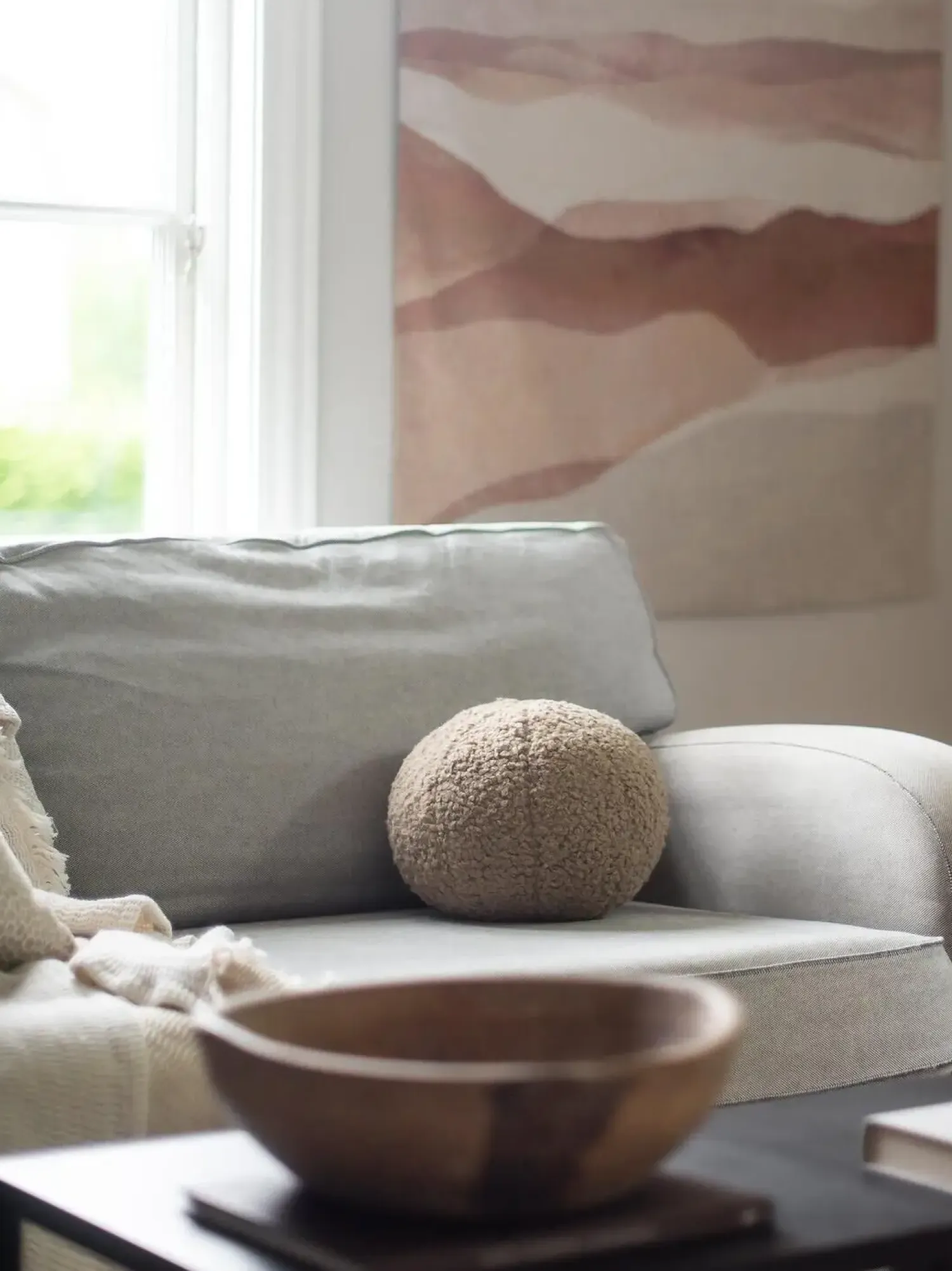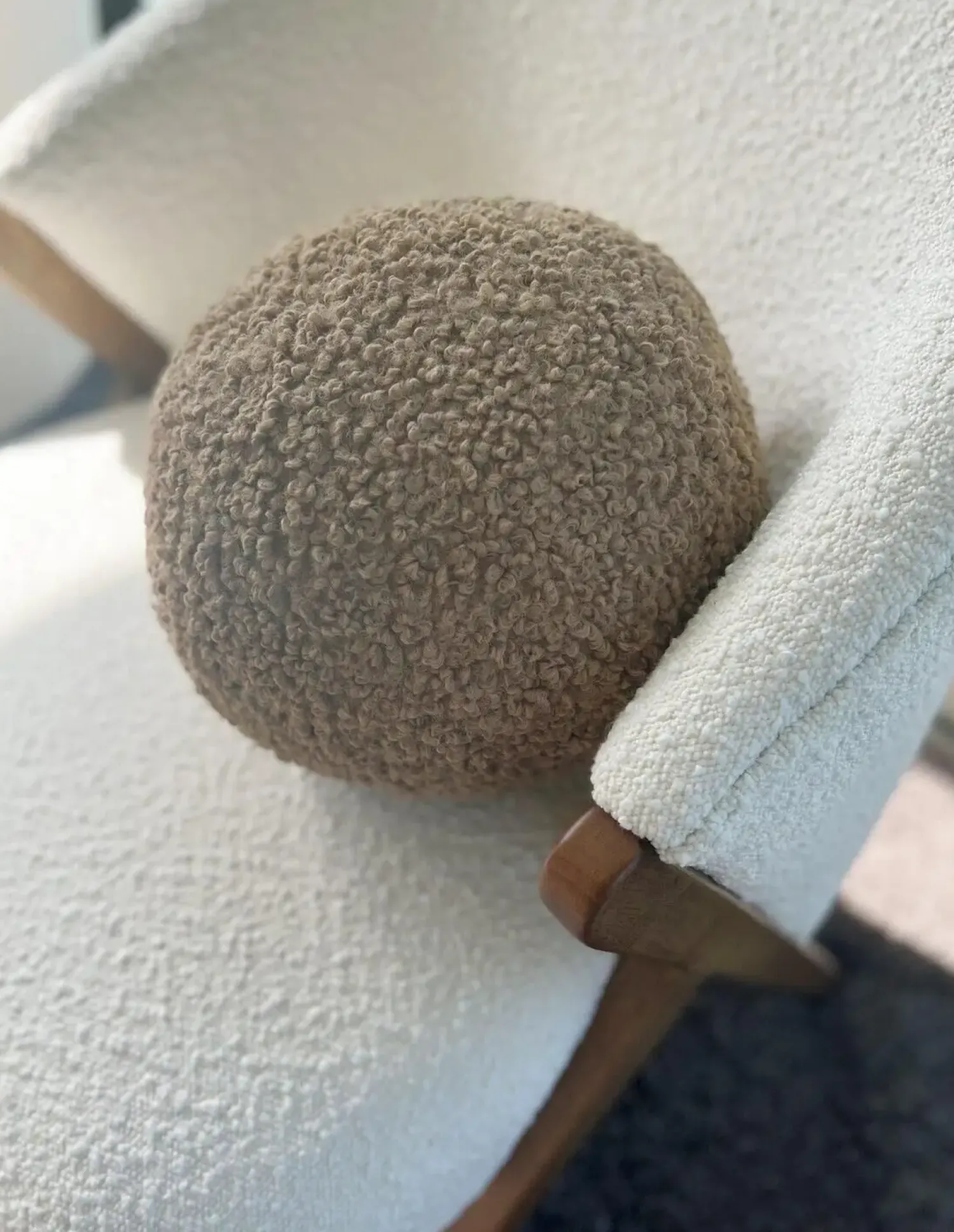 Kugleformet pude med blødt, flosset stof. 25 cm i diameter. Formen gør den nem at placere og fyldet giver god støtte.