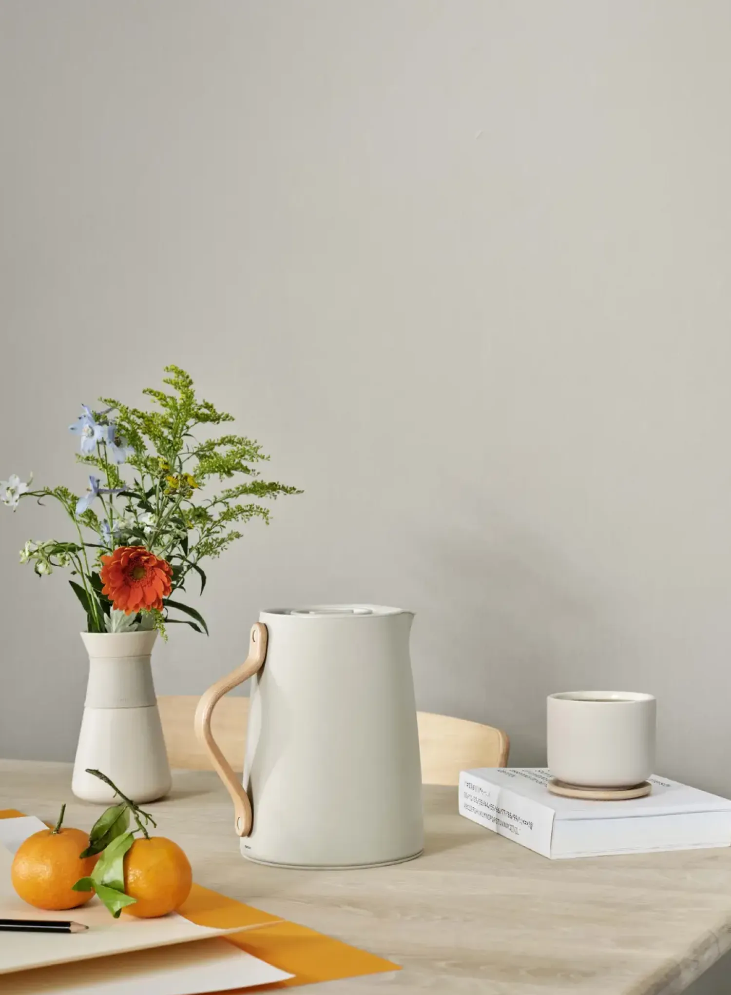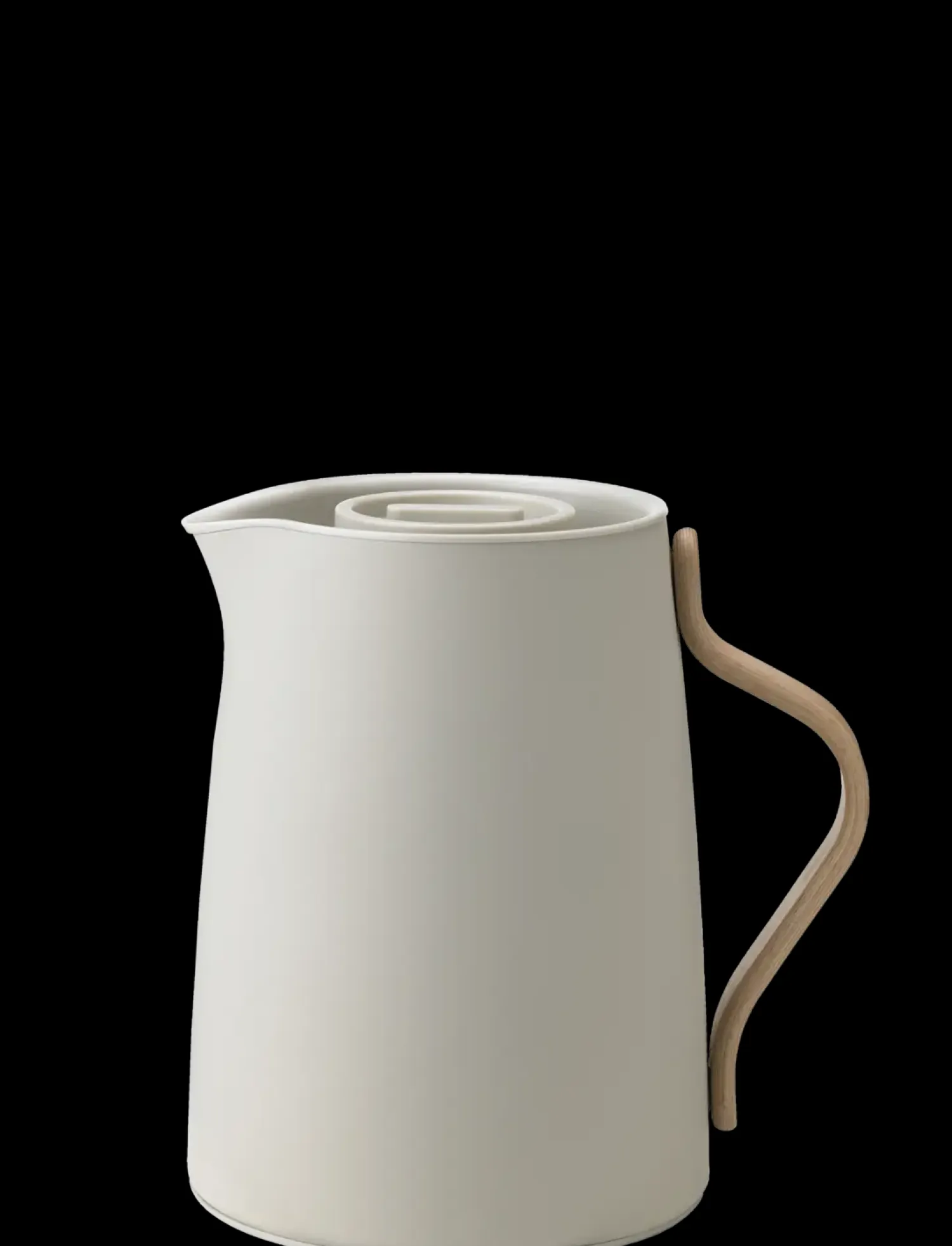 Emma seriens revolutionerende te-termokande i lakeret rustfrit stål med stålindsats og indbygget tefilter sætter nye standarder for te-brygning. Med et enkelt twist på låget lukkes det indbyggede smart-filter og teen stopper med at trække. Kanden, der indeholder 1 l., er designet af HolmbäckNordentoft i et moderne, skandinavisk design, der kombinerer lakeret stål med en hank i bøgetræ. Den stoflige sandfarve giver kanden et keramisk udtryk. Emma serien – en smuk designklassiker til hverdagen.