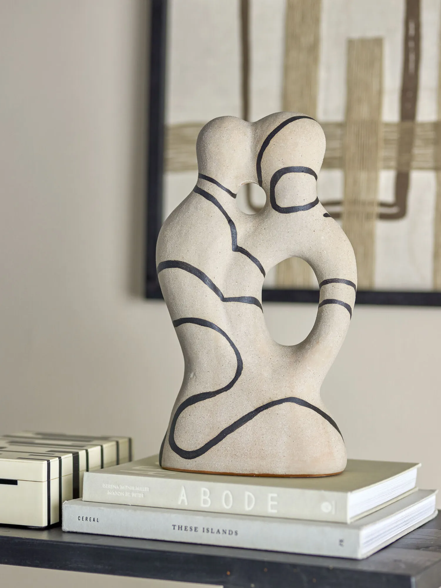Den reaktive glasur og håndmalede dekoration giver hver skulptur sit eget særpræg. Du vil kunne se små variationer i både farve og mønster, som gør netop din Eugenie Deko særlig. De sorte linjer danner bløde, organiske mønstre.