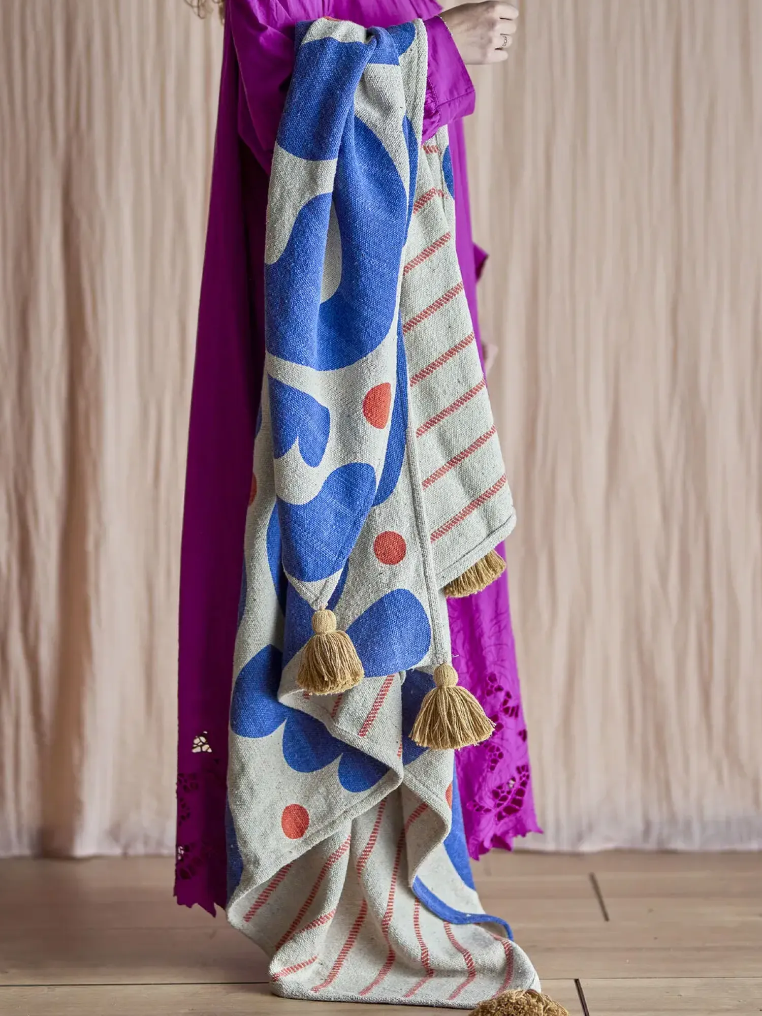 Dette genanvendte bomuldsplaid har et mønster i blå og røde toner med en vævet finish. Bagsiden har vævede røde striber, hvilket giver dig to forskellige udtryk at vælge imellem. Plaidet er designet til at tilføje komfort og variation til dit hjem.