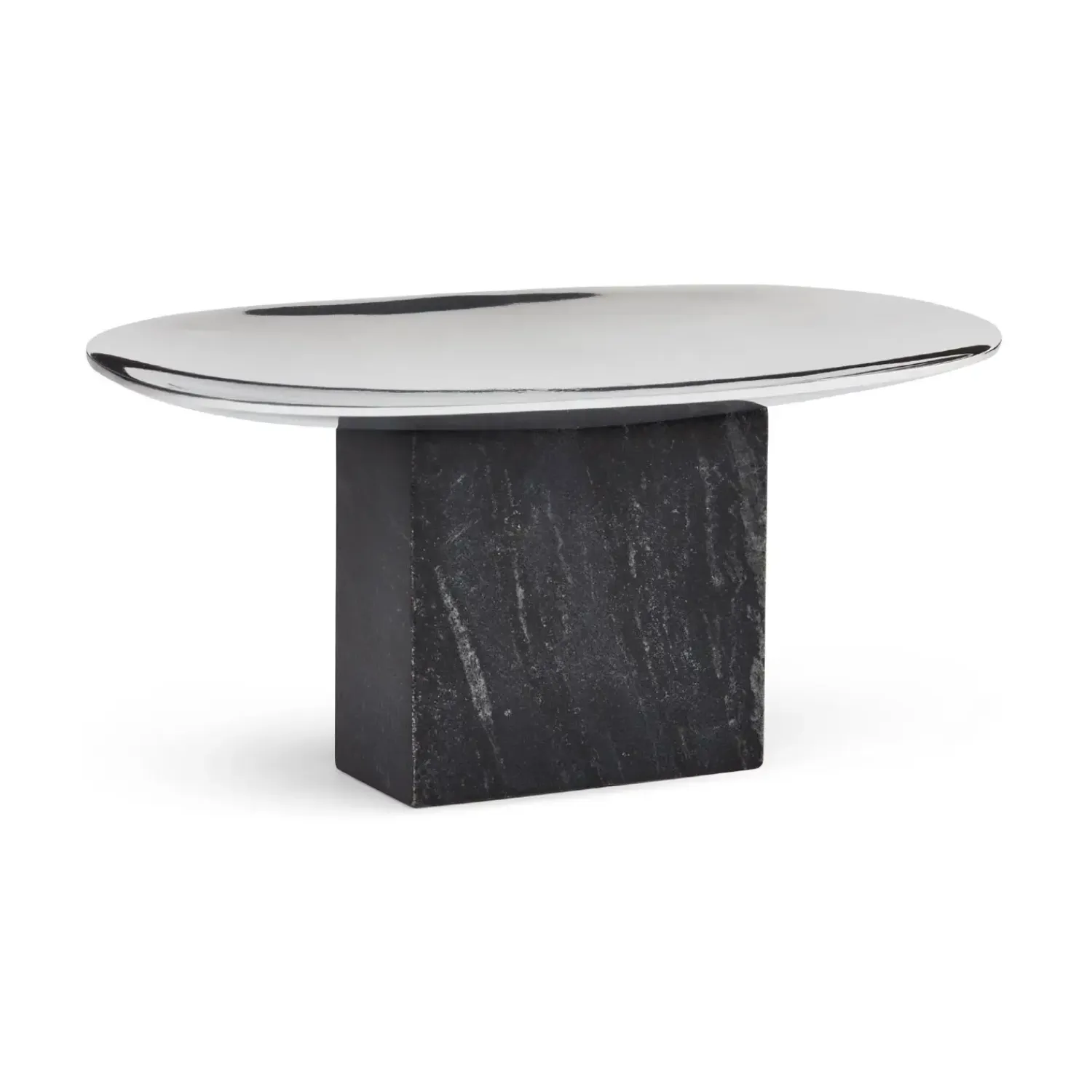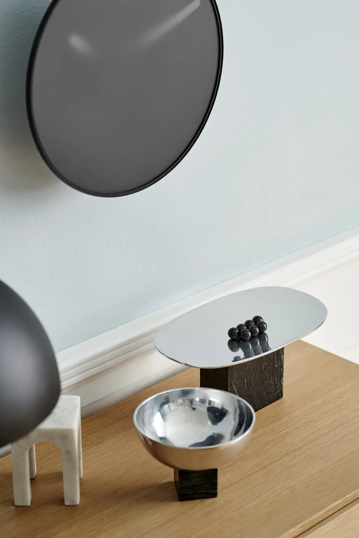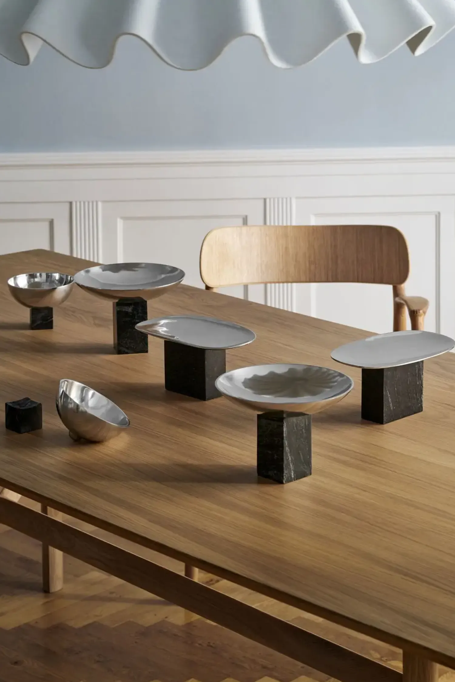 Sapoto serien af smukke serveringsskåle og -fade er lavet af spejlblanke aluminiumsskåle og en sort marmor plint som støtte. Sapoto serien vækker nysgerrighed og indbyder til en raffineret borddækning. Skålene kan også bruges på badeværelset til fornemt at udstille cremer eller smykker.